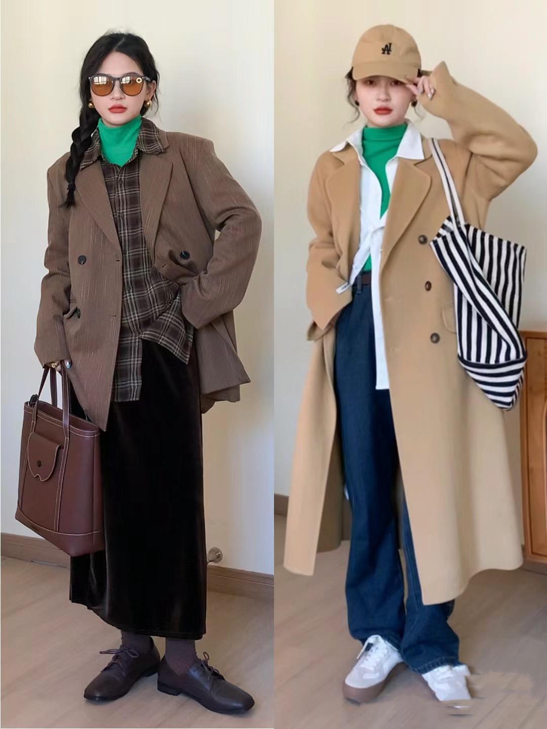 冬天裏的疊穿,可以塑造出更清晰的層次感。過年走親訪友的時候,可以讓自己的穿搭更加俏皮精緻一點,所以半高領打底衫+襯衫的疊穿就很應景。