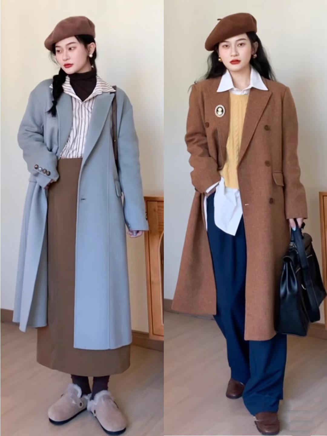 大衣+半高領打底衫+條紋襯衫+半身裙
