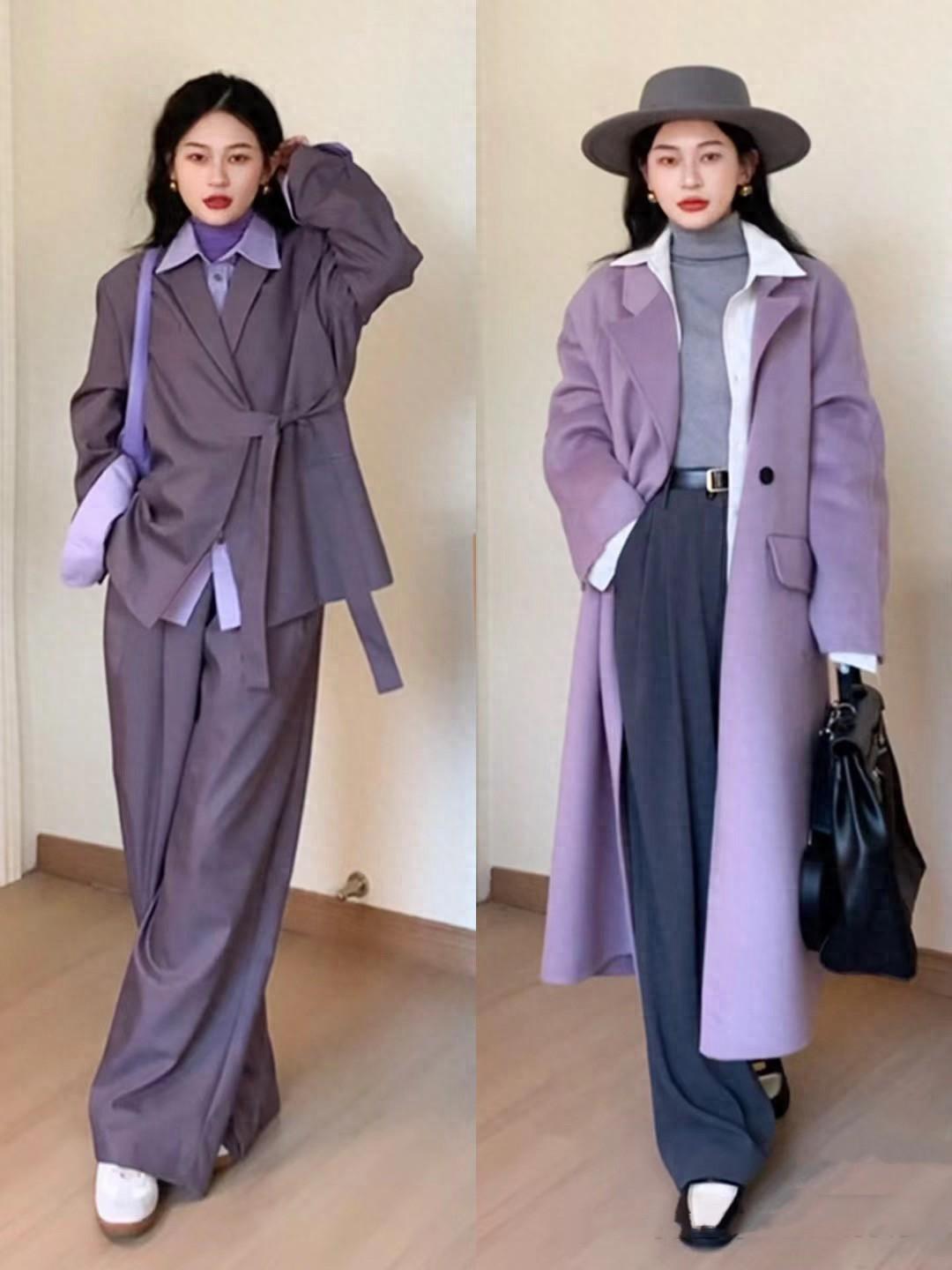 我們可以選擇一身不同飽和度的紫色疊搭,也可以用貴氣的紫色來搭配高級的灰色。淺紫色大衣,配灰色西裝褲、打底衫,隨性優雅又透着幾分爲溫柔。