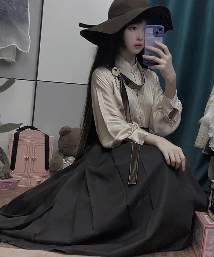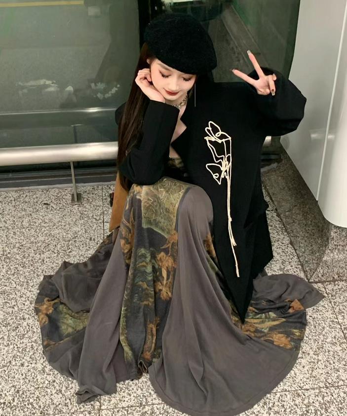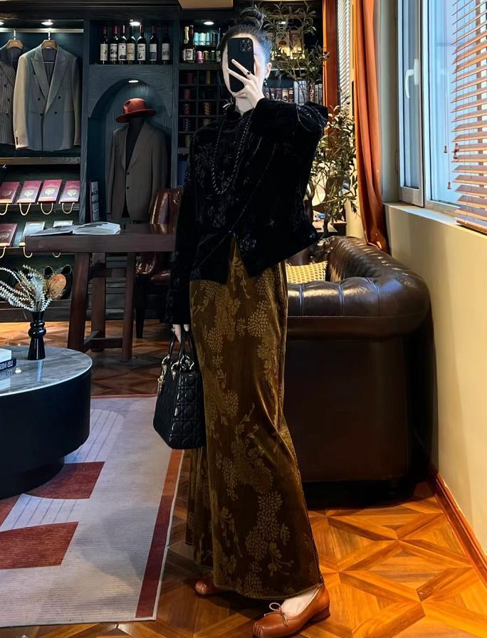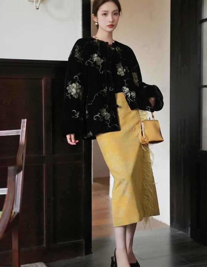 解鎖中式老錢風穿搭,黑色+黃色的撞色組合,有種很貴氣的感覺,也十分高級,中長半身裙,上面一些花紋的設計,細節感十足。