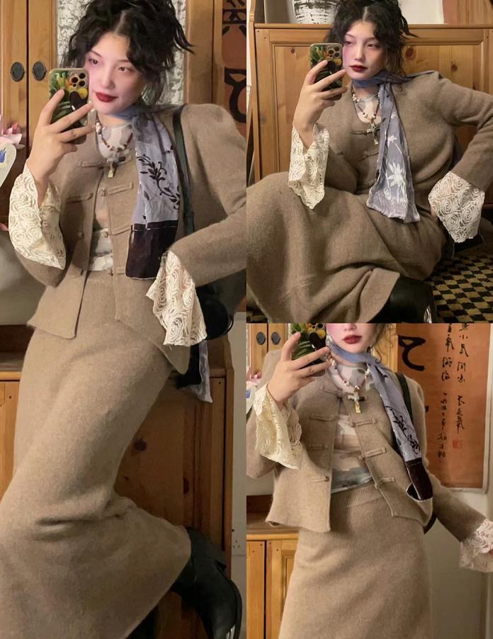 是氣質大姐姐的純度,中式老錢風,栗子棕的配色,實在是太符合秋冬的意境;額,整個穿搭利用的是上短下長組合,很好優化身材比例,顯高挑又顯腿長。