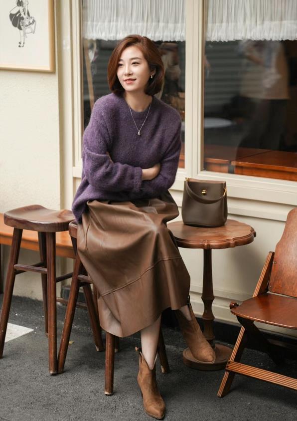 溫柔大姐姐風的穿搭,很實用漂亮,紫色的基礎款毛衣+棕色半身皮裙,小短靴的顏色與裙子一致,和諧又減少出錯。