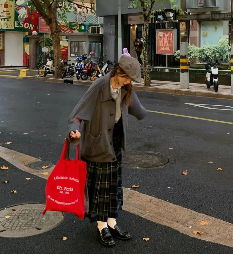 灰色毛呢外套+格紋半身長裙,這樣搭不僅顯復古還充滿了日系風,黑色小皮鞋點綴,讓整個着裝都充滿了時尚的味道。