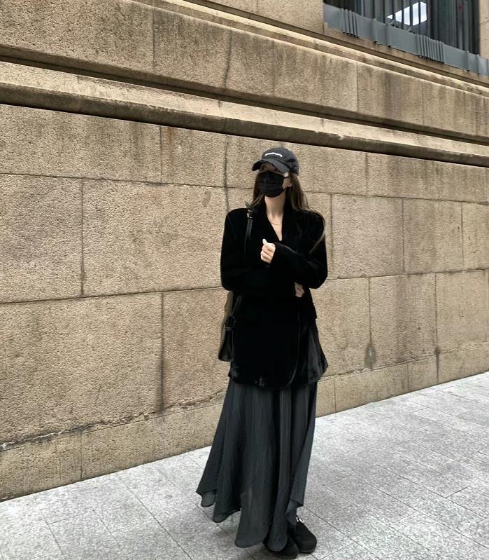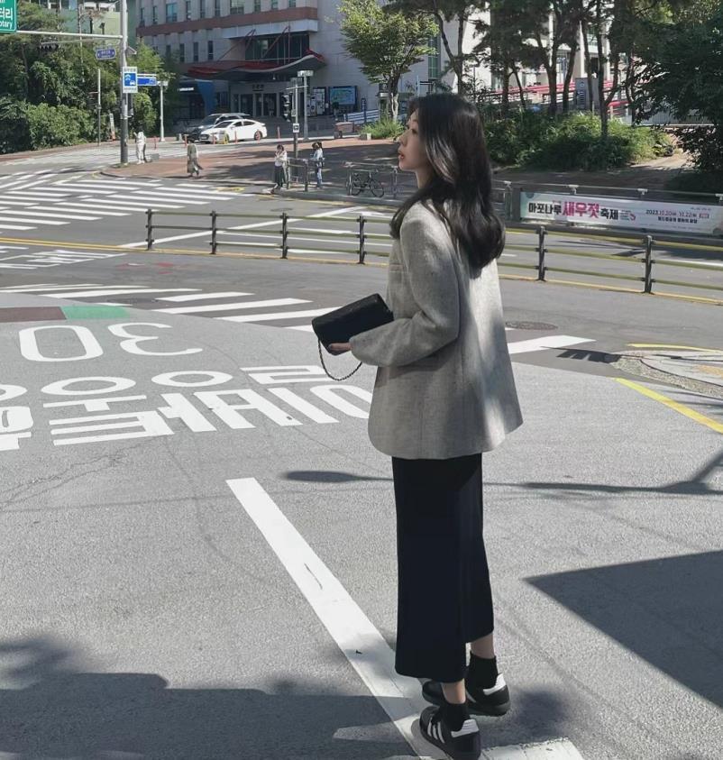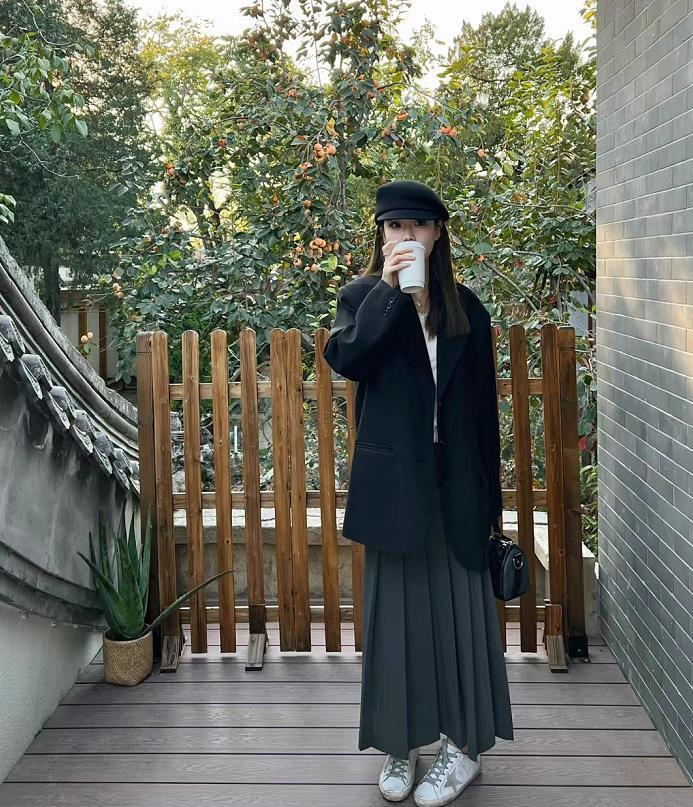 淺色西裝外套+黑色西裝半裙,深淺的對比,層次感十足,結合一雙運動鞋來配,又爲整個着裝增添了幾分休閒氣息。