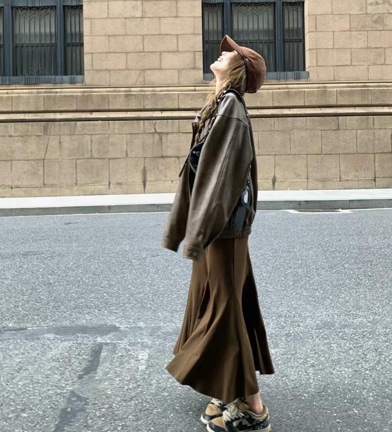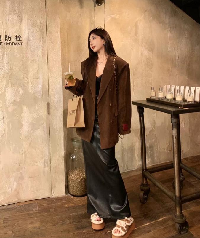 棕色西裝+黑色半身裙,真的既有美貌又溫暖,既不失氣質又幹練,還帶着一點點酷颯,可通勤可逛街約會。