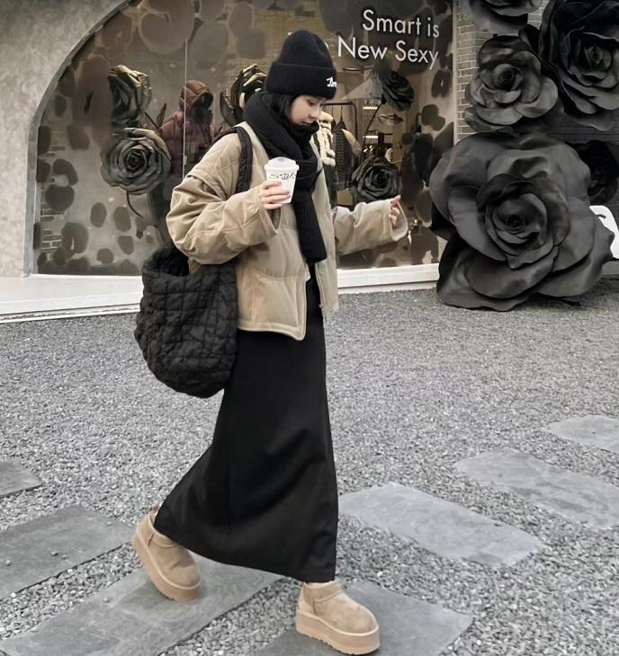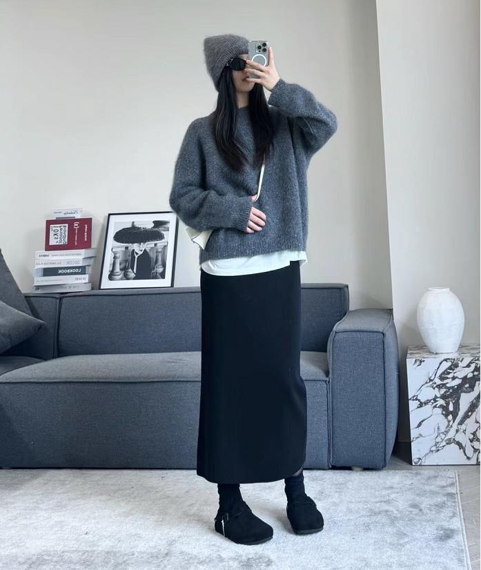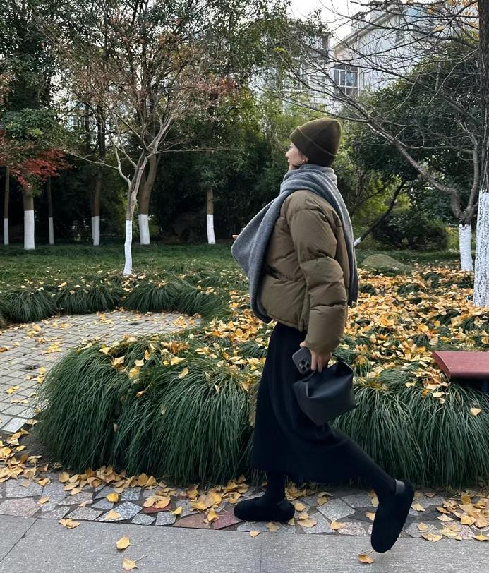 大冬天的南方女孩,該怎麼穿?麪包服+針織半裙,保暖又輕便,因爲下身是深色的,在視覺上有着瘦身的效果,很藏肉顯瘦。