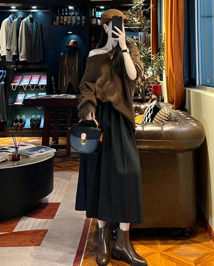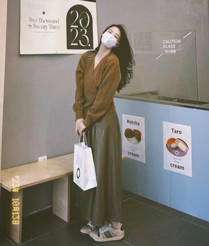 栗子色是我一直很喜歡的顏色,低調含蓄,自帶復古氣息,這件栗色毛衣真的很漂亮,顏色帶着滿滿的氛圍感,搭配黑色百褶半裙,減齡又時髦。