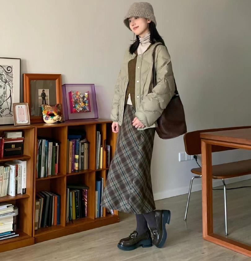 灰綠色系的穿搭復古又溫柔,這一件菱格薄款羽絨服,很適合南方的冬季,輕便又溫暖,內搭高領打底+羊毛馬甲,很協調的復古感。下身搭配格紋半身裙+皮鞋,乖巧又不失溫柔。