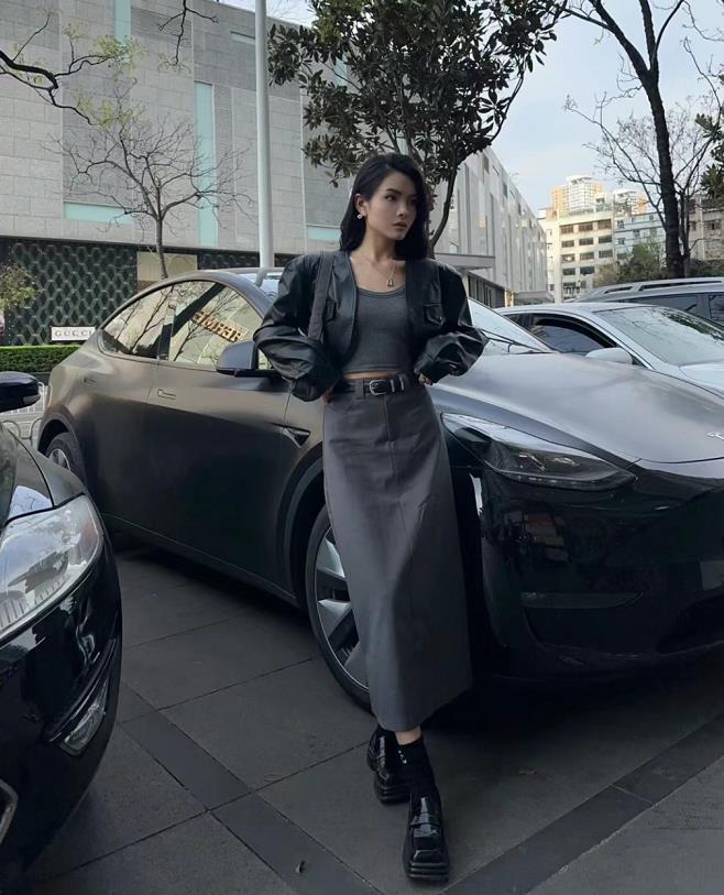 灰黑的配色可是很耐看高級的,怎麼搭都不出錯,這一套運用的是上短下長的組合,優化身材比例,還能拉長腿部線條。
