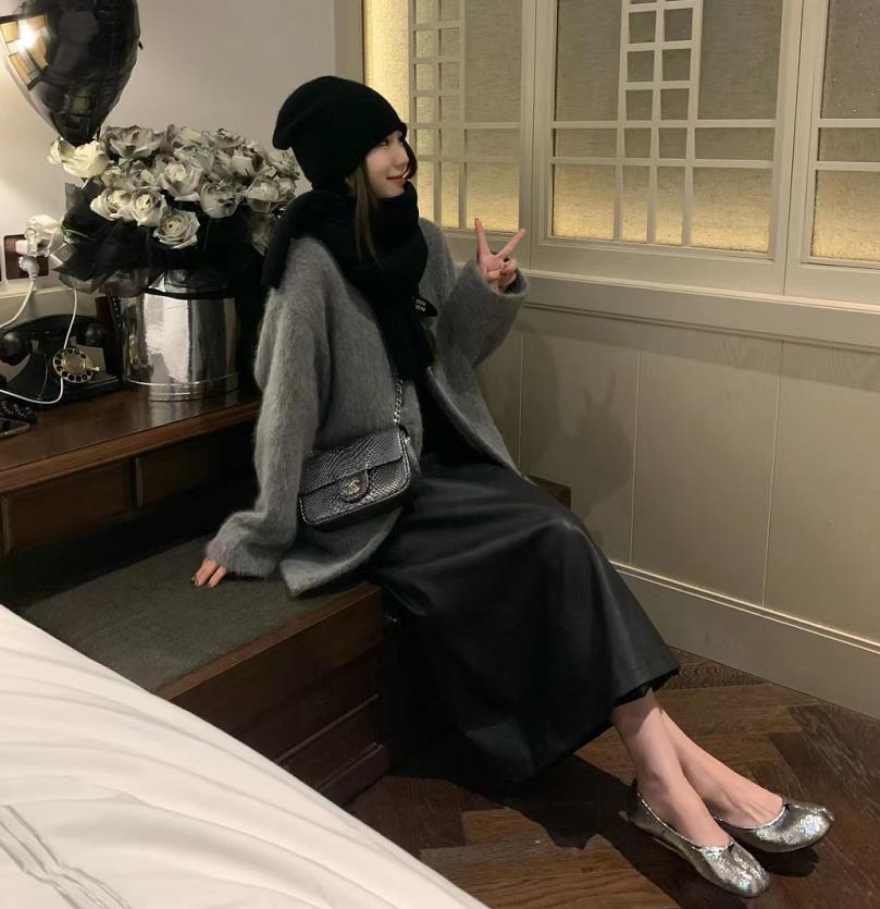 灰色+黑色的配色,真的最時髦高級了,耐看且不出錯,灰色兔毛外套,穿起來也非常保暖,搭配黑色半身皮裙,怎麼都穿不膩。