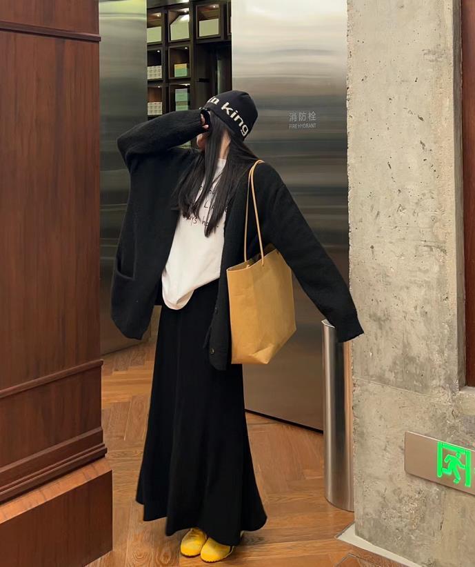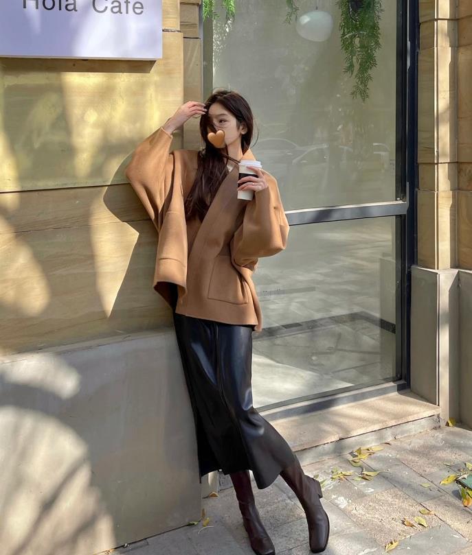 對這種黑色直筒針織半裙真的沒有抵抗力,適合各種身材穿,顯瘦效果可不是一般的好。上衣是一件淺色毛呢外套,寬鬆的版型,更是藏肉和包容。