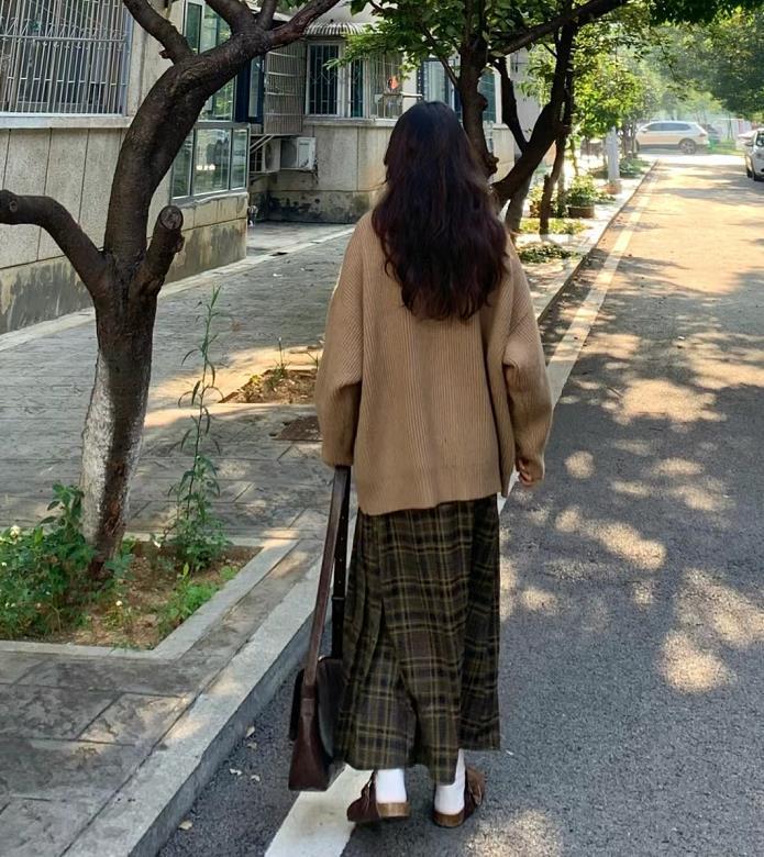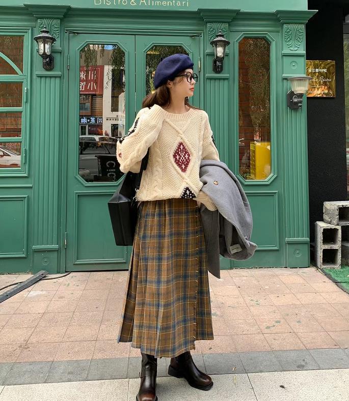 這套也太復古了吧,毛衣的顏色奶呼呼的,穿起來很保暖,單穿或者內搭都行。下身選擇的是格紋半身裙,復古俏皮感拉滿。