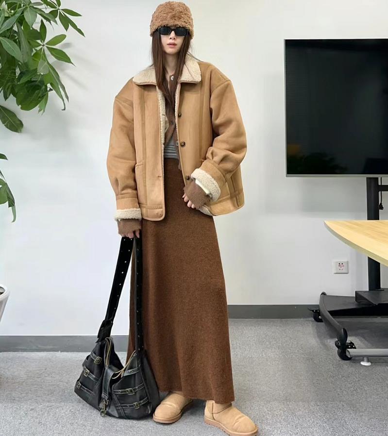 濃濃的復古風穿搭,喜歡的姐妹就學起來,羊羔毛外套在冬天就是很實穿,抗風又保暖,下身搭配的半裙是針織面料的,裙子長度到腳踝,真的擋風又藏肉。