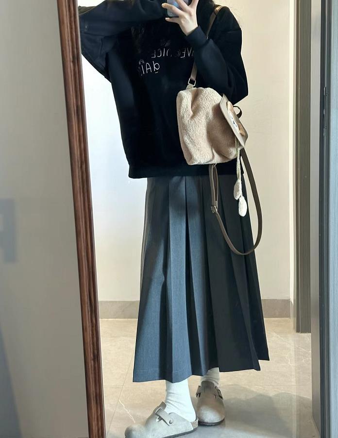 黑色衛衣+灰色百褶裙,纔是南方秋日正確打開方式,當然,不是很冷的冬季也是可以這麼穿的。怕冷的姐妹,可以在裙子里加打底褲,這樣就更加保暖了。