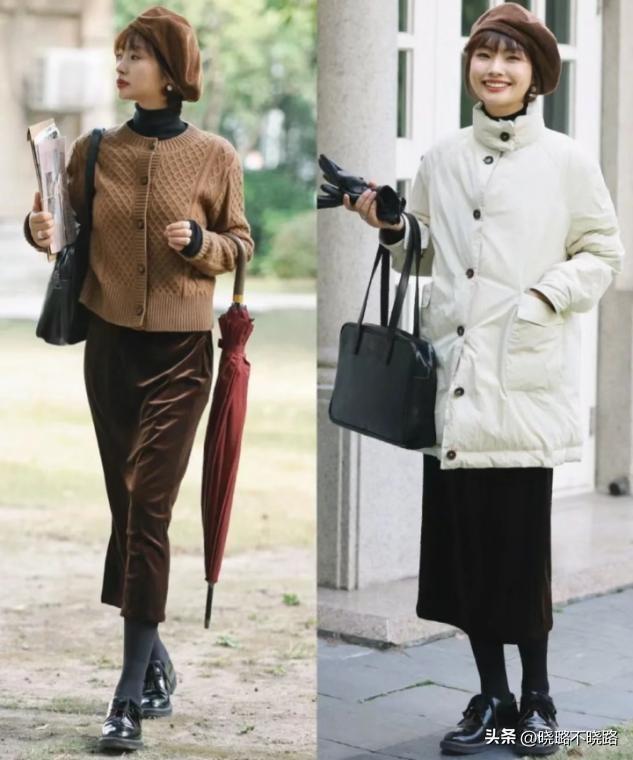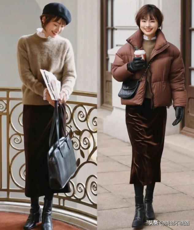 毛衣單品或薄或厚,如果是用來組合羽絨服的話,線衫的厚度就足夠了,用過膝長度的半裙包裹曲線,身材優勢很明顯。