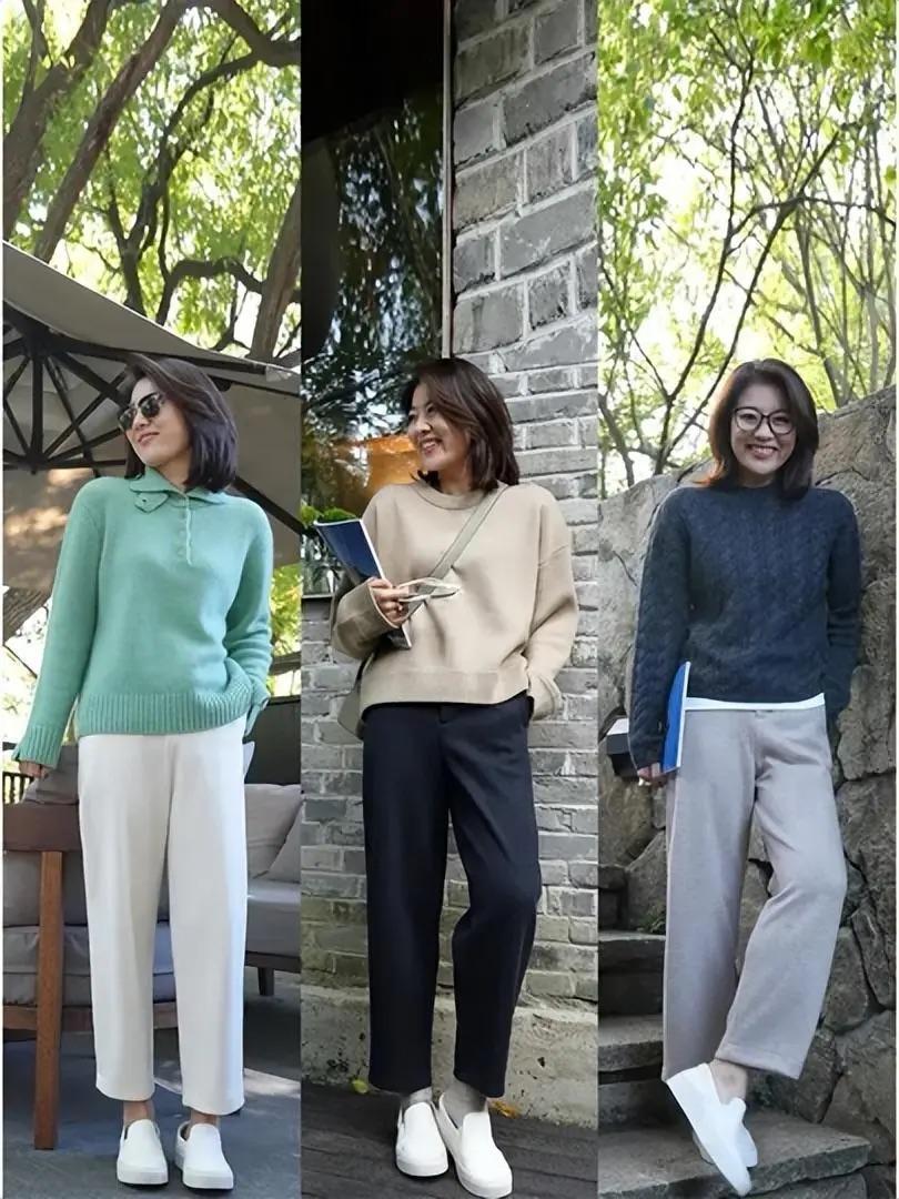 在40+女性的衣櫥裏,毛衣或者針織衫都是比較溫柔顯氣質的單品。選擇毛衣或者針織衫的時候,建議大家搭配純色淨版的設計,乾淨又大氣。