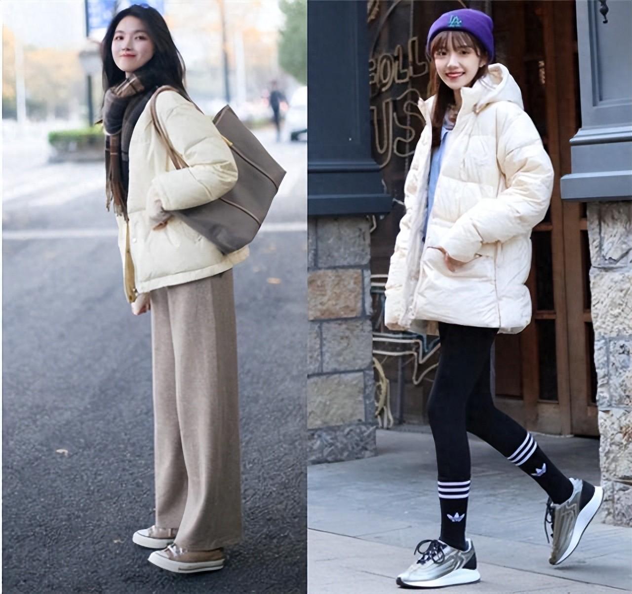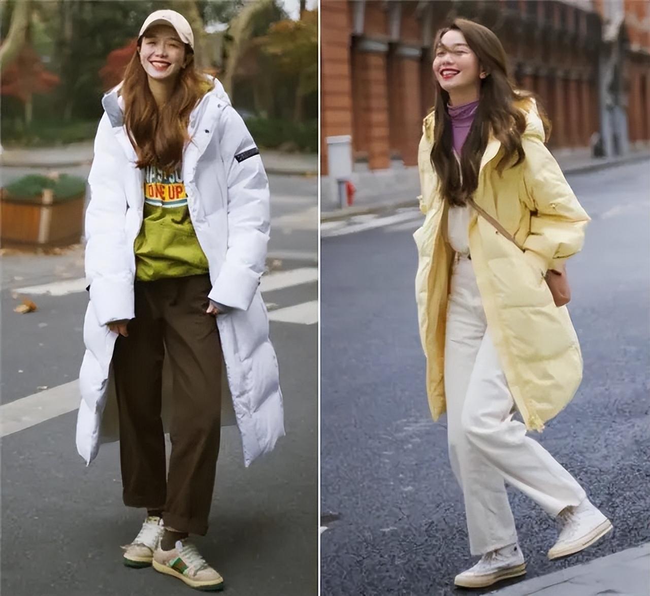 穿一件中長款的羽絨服,可以搭配優雅的白色或者柔和的黃色,這種顏色清新且甜美。配帆布鞋來穿着,塑造出更輕盈靈動的美,時尚氛圍拉滿。
