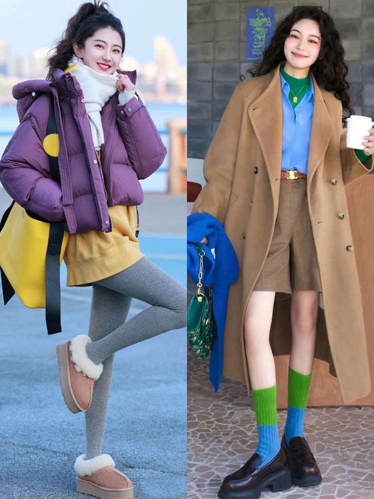 藍色的襯衫、綠色的打底衫,以及藍綠撞色的中筒襪,與內搭的色彩進行完美呼應。像這種駝色與亮色的搭配,就是基礎色+亮色系的搭配,簡單活潑、透着靈動感。