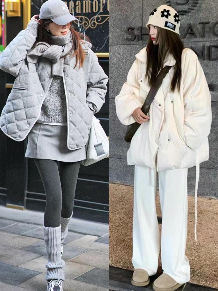 在這個冬天,還有一種非常潮流的方式,就是用寬鬆的大衣或者羽絨服,來搭配緊身的鯊魚褲。鯊魚褲擁有像鯊魚皮一樣的質感,穿起來很顯瘦、也很高級。