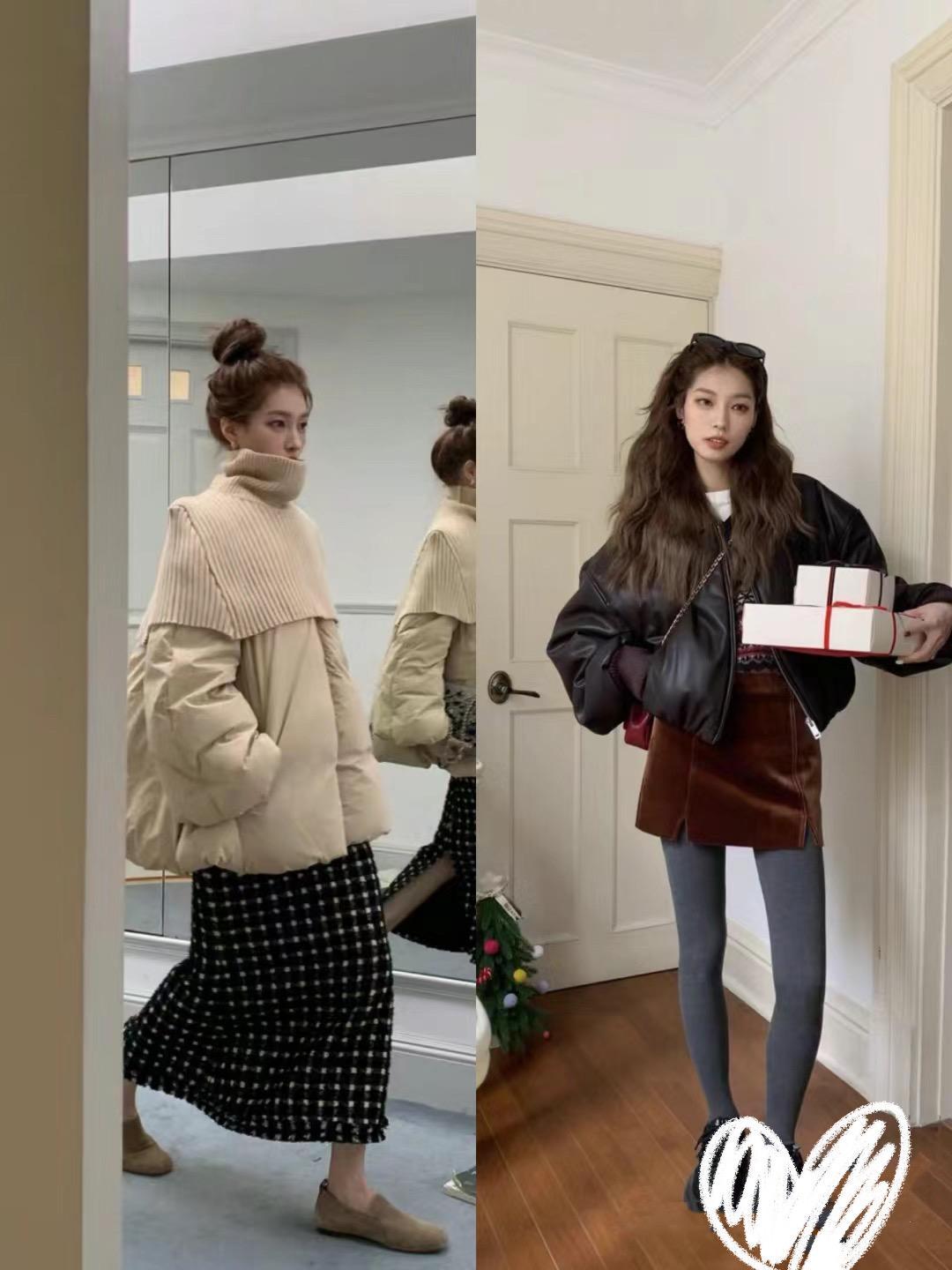 短款的羽絨服,我們可以配修身的半身裙來穿着,一種俏皮又時髦的美、也格外的讓人歡喜。像這種短款的夾克風羽絨服,配絲絨或者毛呢質地的半身裙,俏皮中帶着幾分貴氣,時尚氛圍更強。
