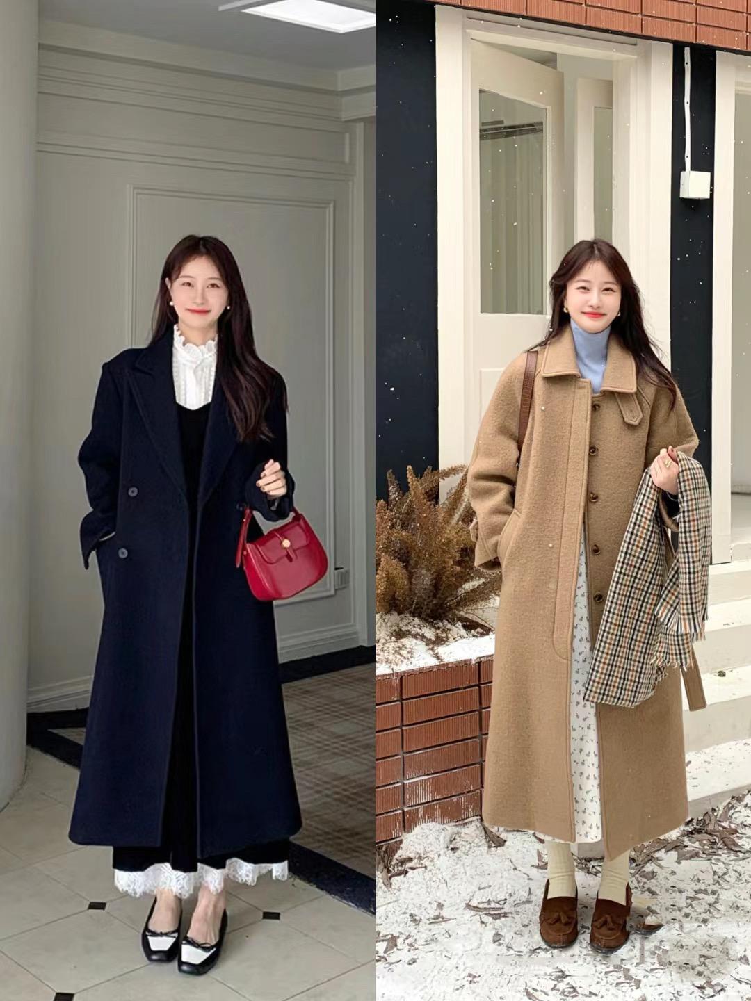 喜歡韓系穿搭的女生,也會更加喜歡長大衣。長度過膝的大衣,有一種更難得的高級美。即便是小個子女生,穿上長款的毛呢大衣也可以優雅大方。