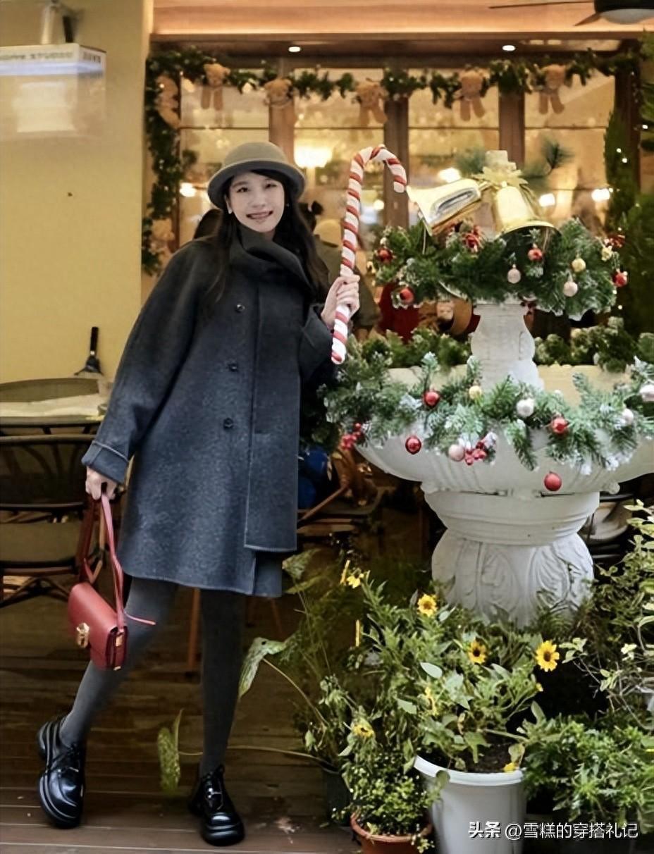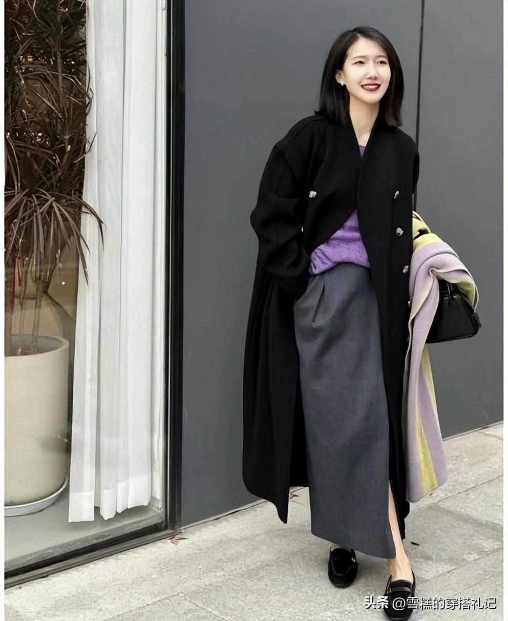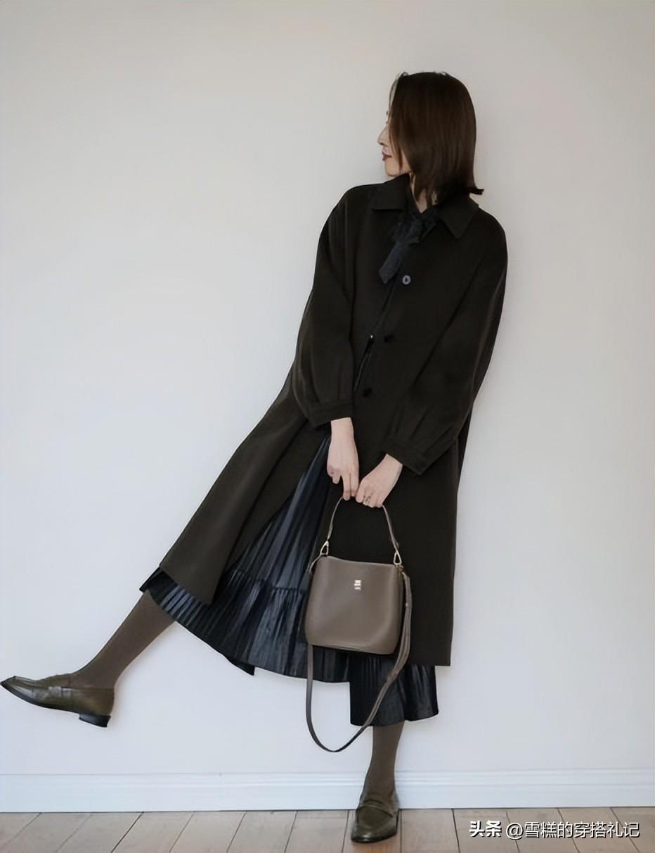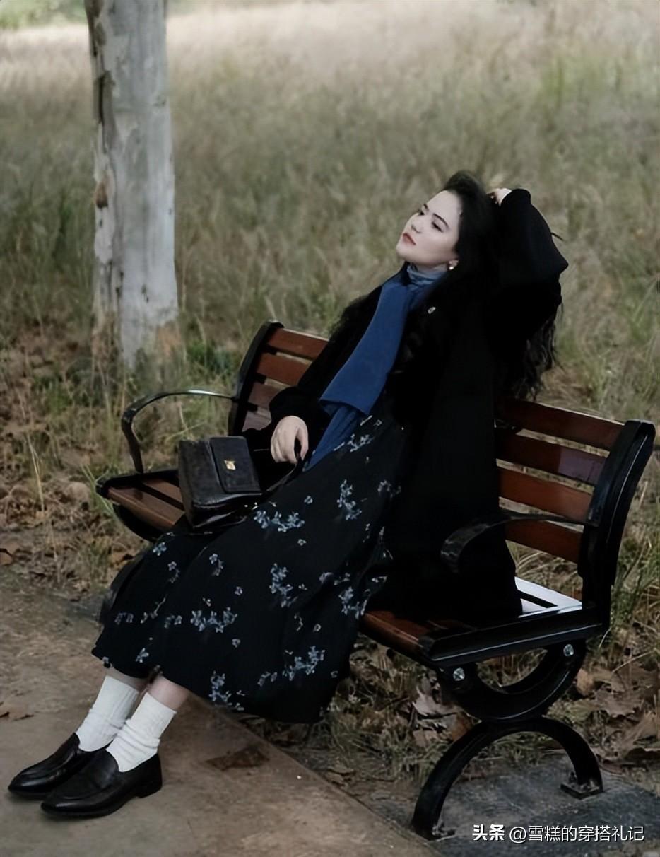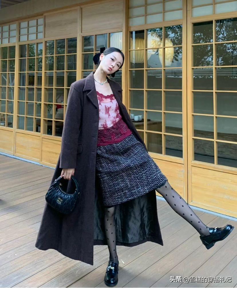 而褲襪這個單品本身風格就比較沉悶保守,大面積露出的話駕馭得住是復古,駕馭不住就是土氣了,因此我們要選擇長一點的半裙做搭配,出錯的概率會小很多。