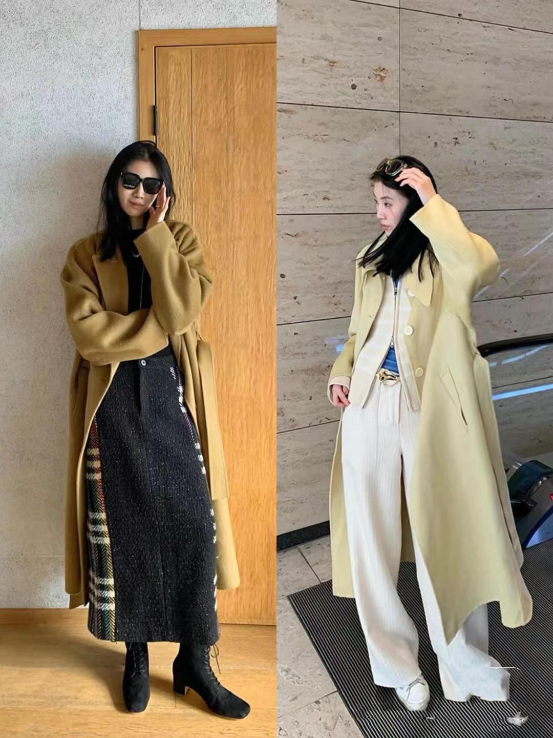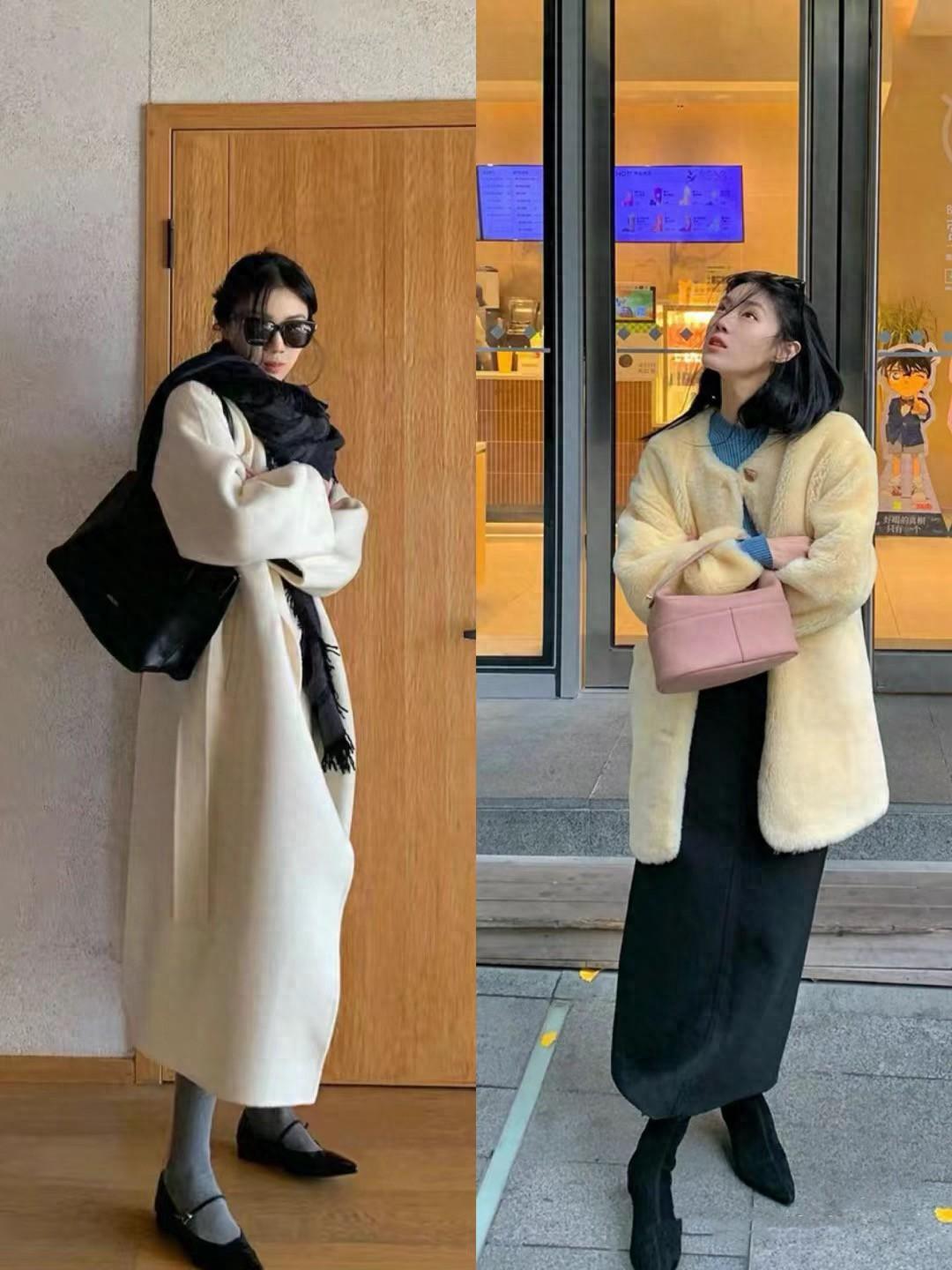 將純白色換成米白色、或者鵝黃色,就更加溫柔大方。這種寬鬆一點的毛呢大衣、大面積的米白色疊加,更充斥着溫柔的力量。