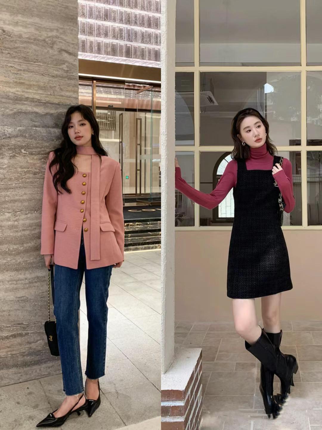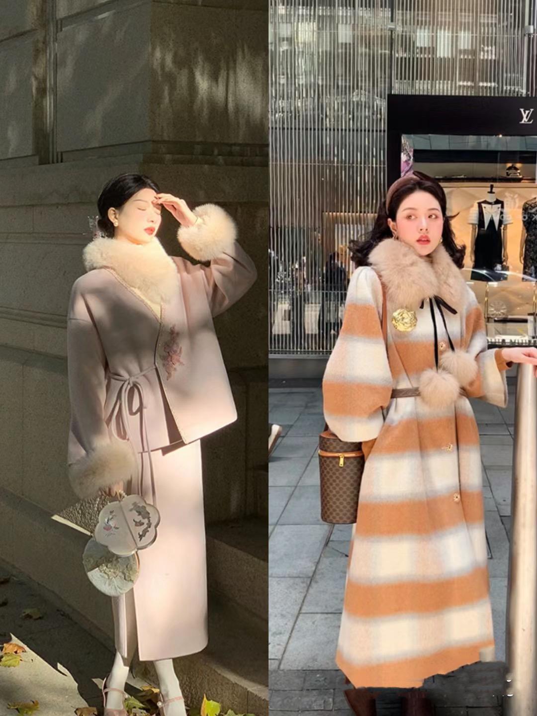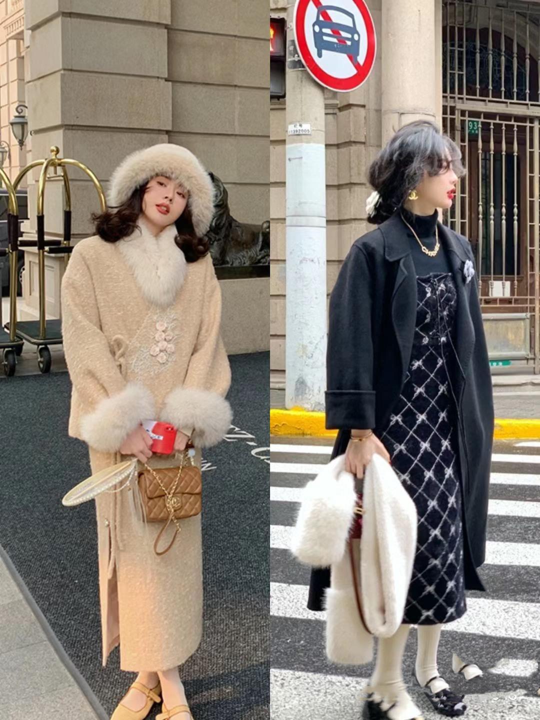 淺粉色的毛呢套裙,搭配了貴氣的毛領溫暖又洋氣。如果想要更加大方一點,也可以嘗試用毛呢大衣來配大毛領穿着,又貴又美!