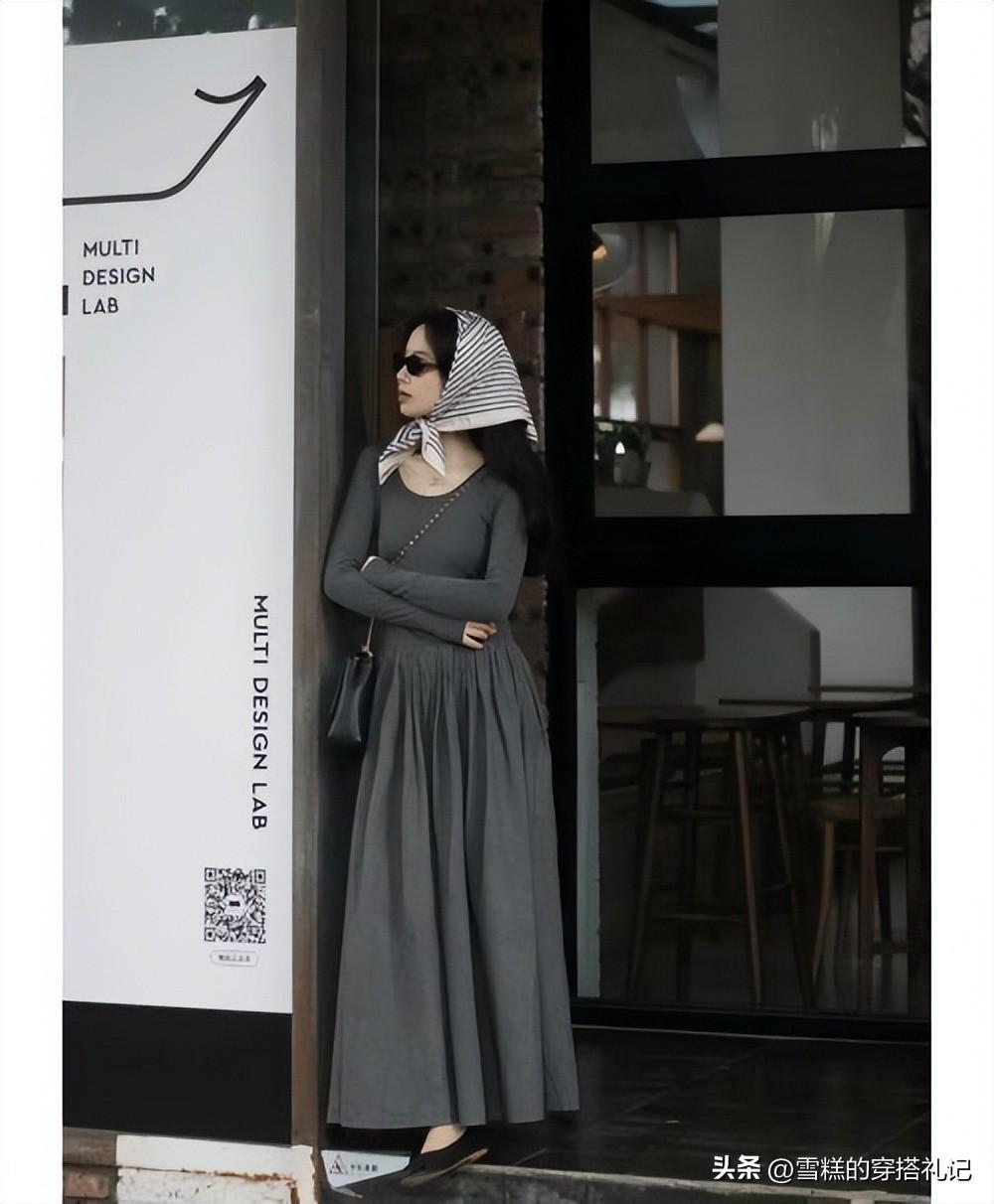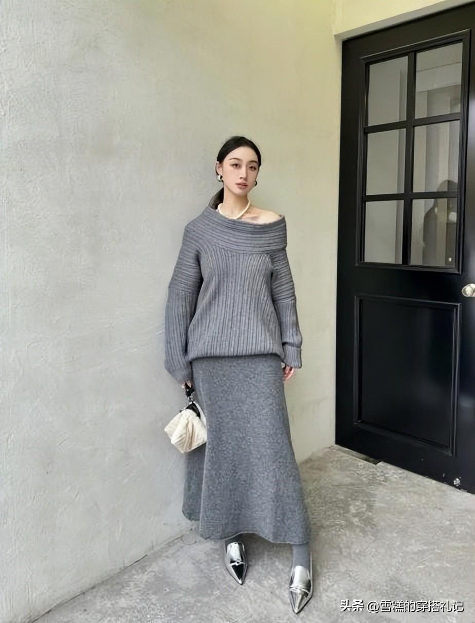 如果你選擇了灰色長裙這種one piece的單品,那麼色彩上多半是沒有起伏的純色,這個時候我們就要從領口入手了,選擇大領口露膚,利用膚色和純色做對比,也能展現層次感哦。