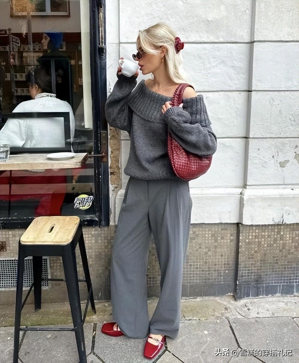 日常中的泥色穿搭可以穿得“年輕”一點,我們可以採取亮色點綴法去塑造灰色穿搭,比如櫻桃紅的加入就能讓灰色穿搭顯得俏皮復古,還沒那麼沉悶。