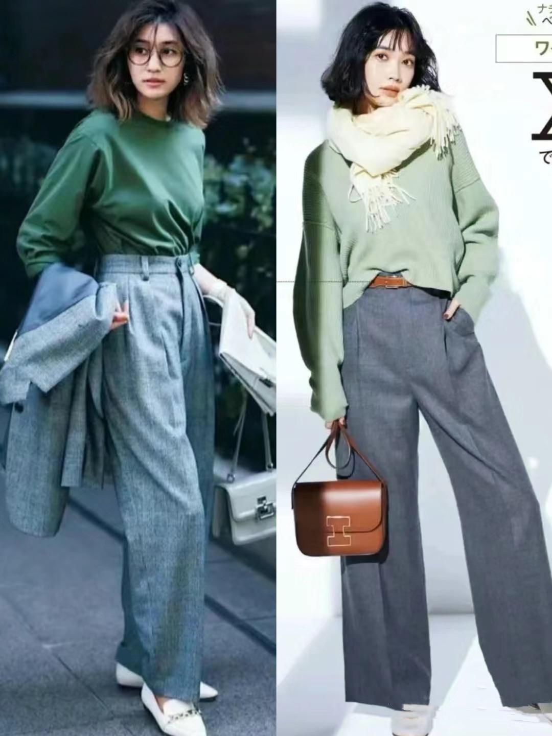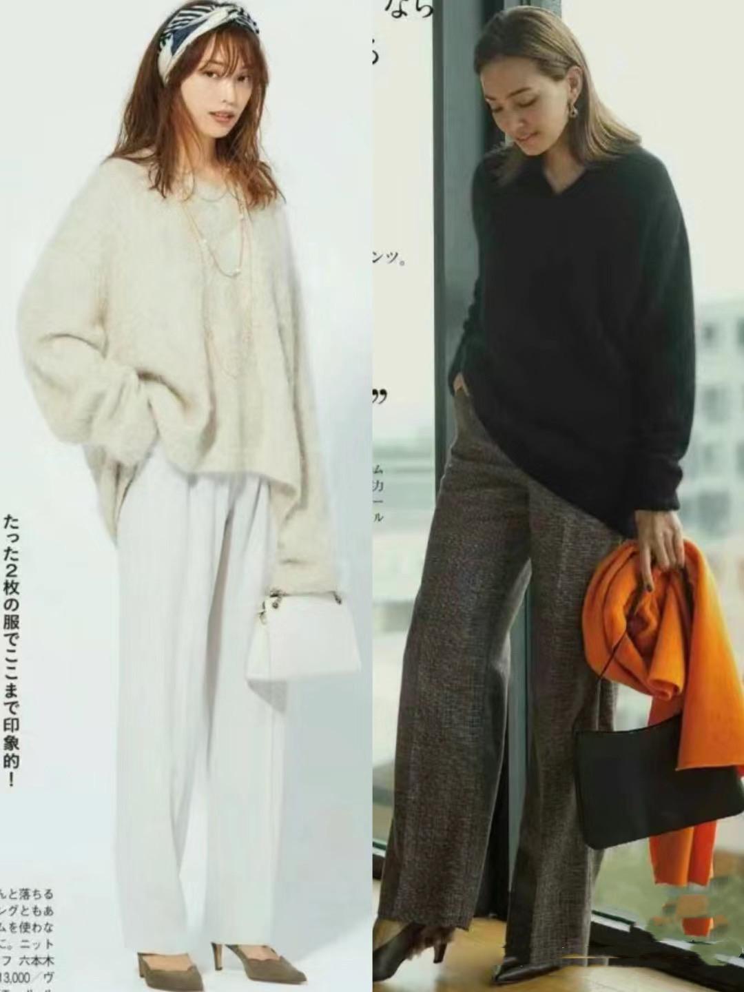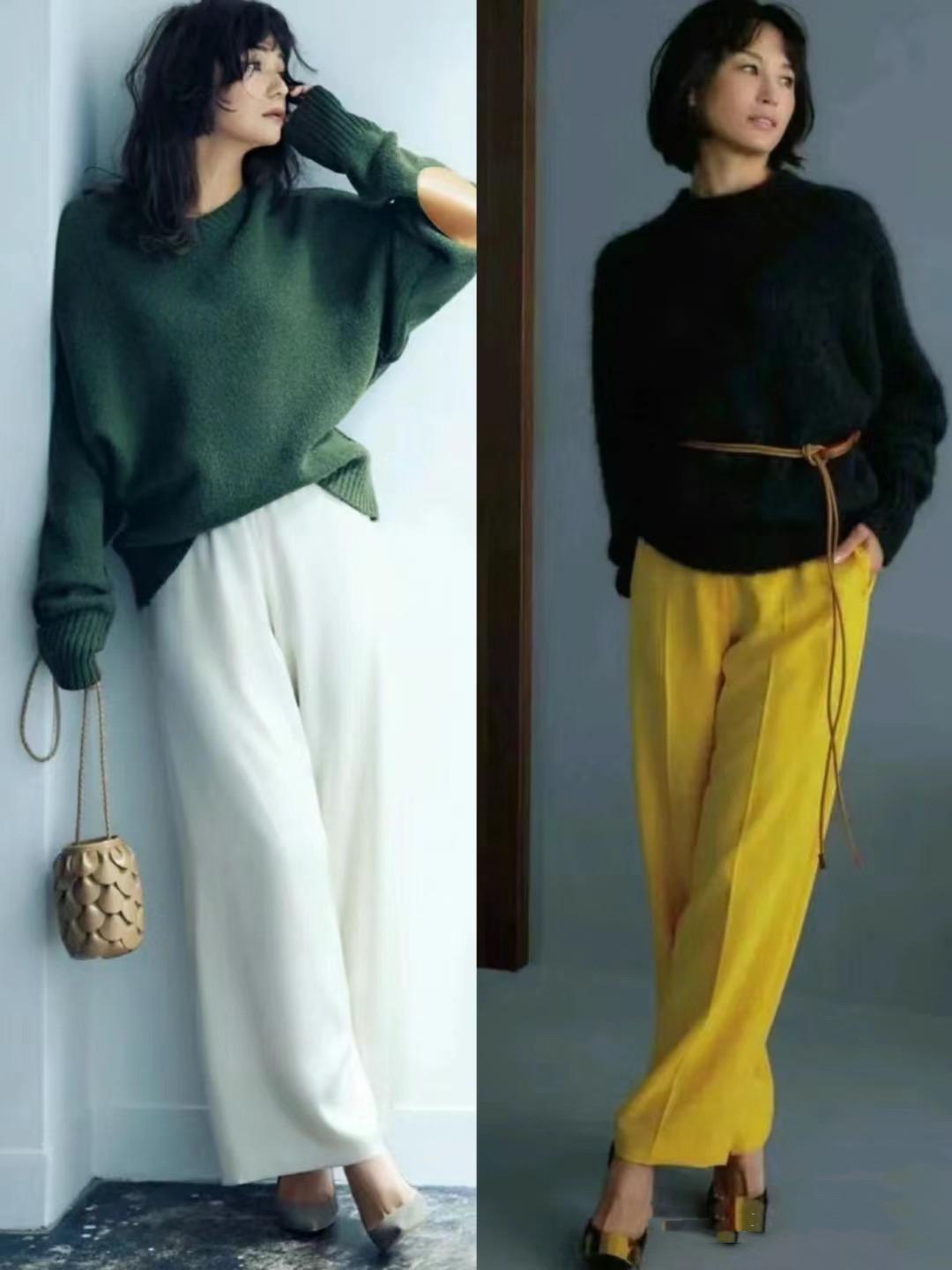慵懶的毛衣,可以配高腰的闊腿褲來穿着。闊腿褲選擇比較寬鬆的版型,對於40+女性的體型,也擁有一定的包容性。垂墜的褲筒,顯得身材也更加挺拔。