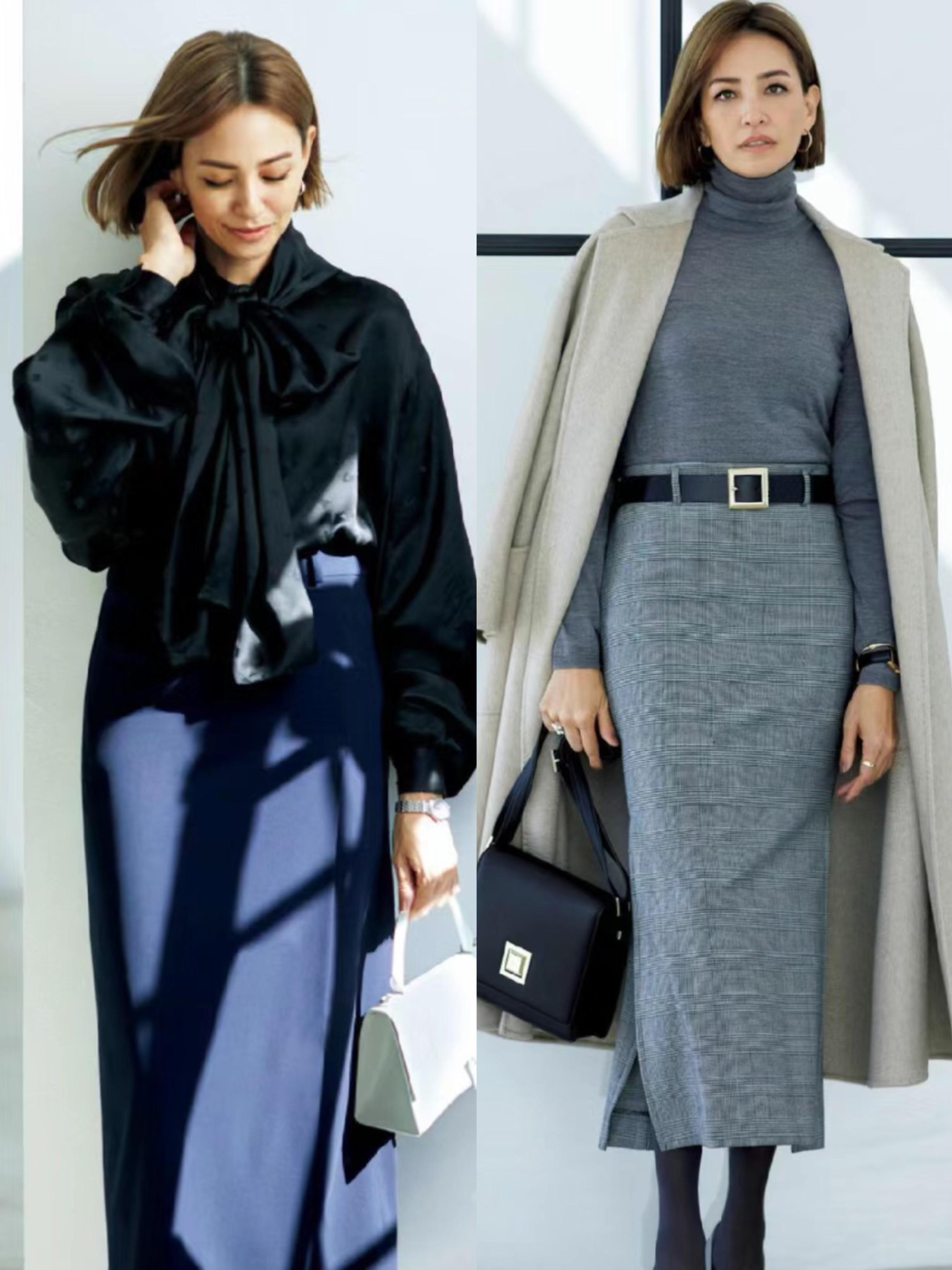 如果到了40+的年紀,你的身形依然挺拔、曲線依然豐潤,完全可以嘗試這種修身的一點的組合方式。修身打底衫,配腰臀部收緊的直筒半身裙,溫柔大氣。修身打底衫,選擇半高領更保暖。