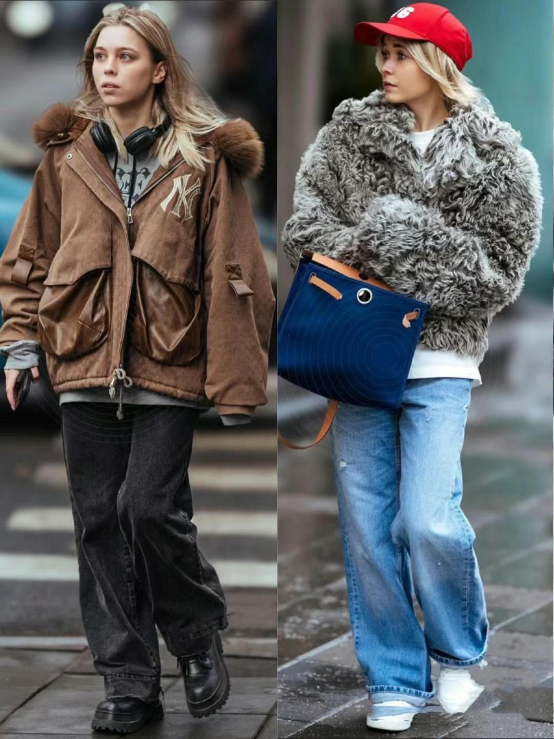 寬鬆一點的短款派克服,剛剛過腰遮胯的長度,最容易表現出身體上的比例感。我們搭配闊腿褲來穿着,有一種舒適又自然的效果。闊腿褲可以配加絨加厚的面料,保暖性更強。