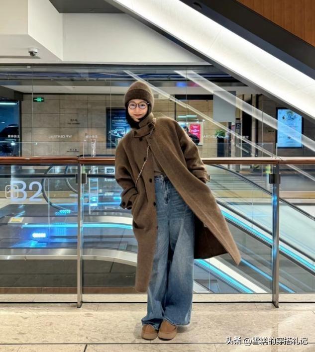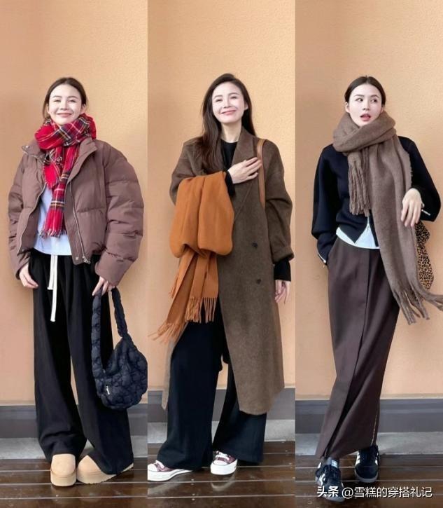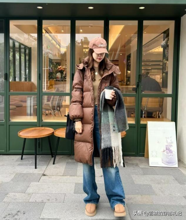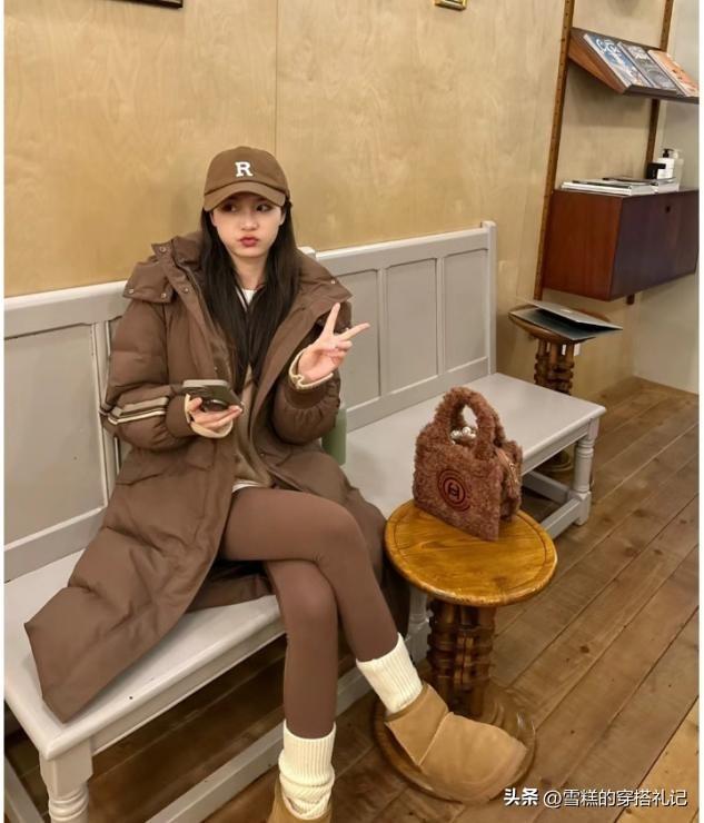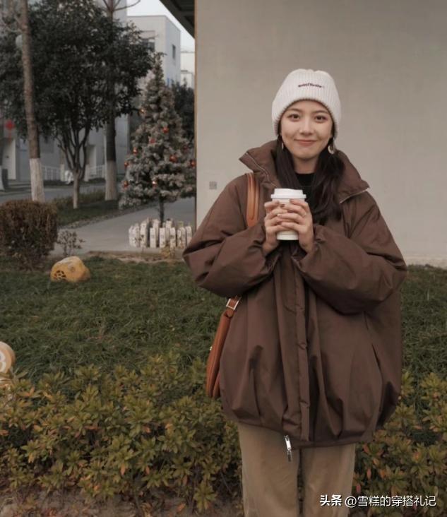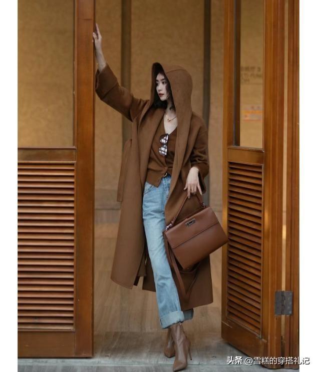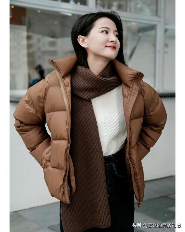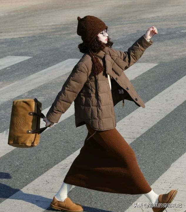 追求軟糯優雅風格的女生,更喜歡穿針織或者羽絨之類的單品,這一類服裝只要增加了厚度,就很容易暴露線條的膨脹感,但如今,我們有了深色調的美拉德色彩作爲襯托,特別推薦棕色和焦糖色的融合,整體可以做好視覺上的線條收縮感。