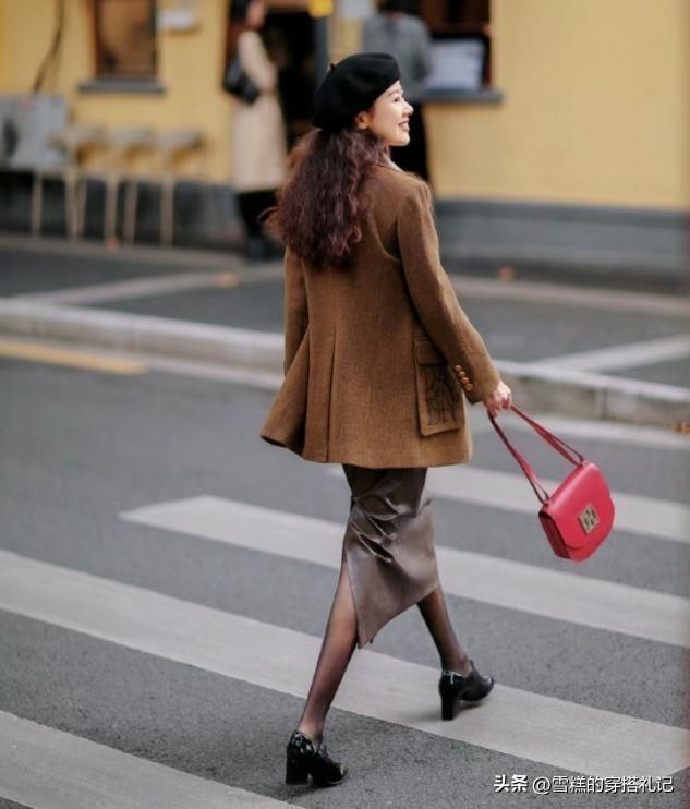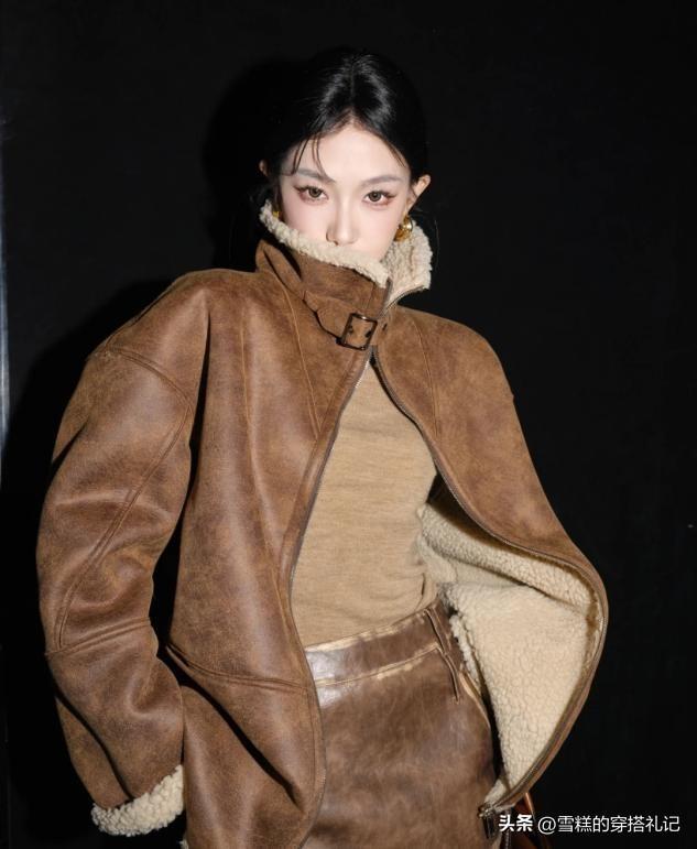如果說冬季又要掌握保暖性,又要掌握時尚感,那麼,皮面和羊羔大衣的質感是最受人歡迎的,這兩類面料質感偏厚,但是用美拉德色系作爲點綴,可以比黑色看起來更洋氣,而且外在形象的輪廓也完全不顯臃腫。
