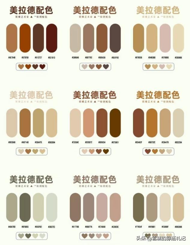 我們以色卡的飽和度作爲區分,會發現美拉德色系雖然顏色暖色調趨同,但是每種顏色的飽和度都非常足,把同一種色系放在一起,也完全不會呈現出單調感,色調的區分性很明顯,所以大面積的穿同色的美拉德色彩,一樣可以穿出顏色的遞進效果。
