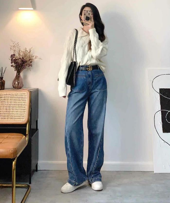 毛衣+牛仔闊腿褲簡約休閒,還有種颯颯的味道,記得要將腰線比例提高起來,腰帶的點綴,不僅修飾身材比例,還很顯瘦。