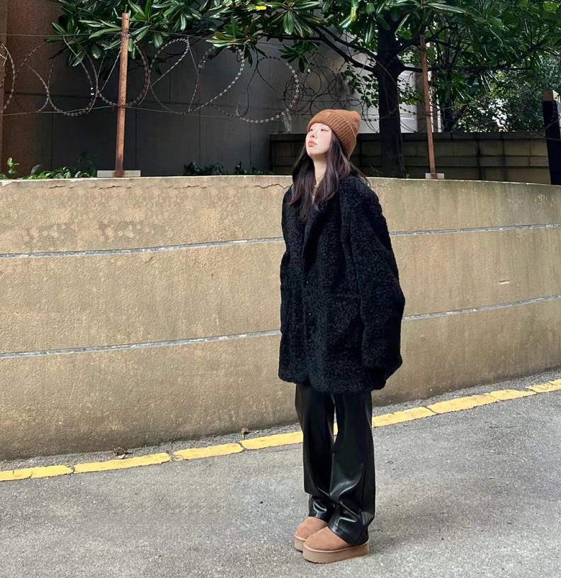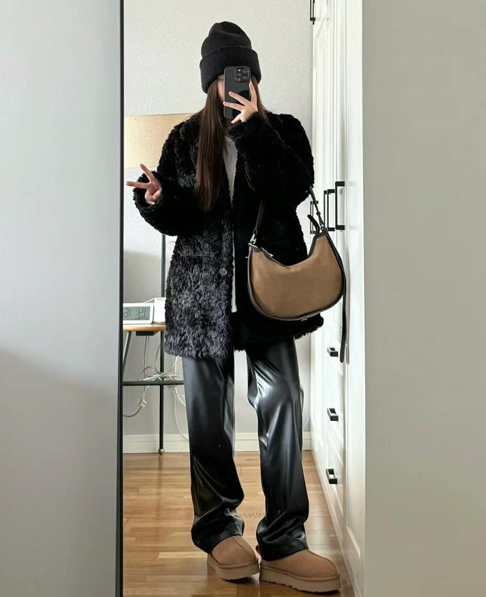 黑色毛毛外套+黑色直筒皮褲,這麼穿實在是太顯瘦了,喜歡這種垂墜感和質感都很佳的褲子,況且在寒冬,皮褲防風效果也非常不錯。