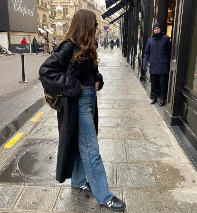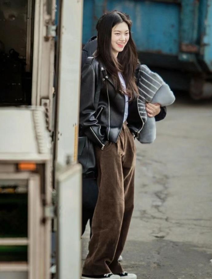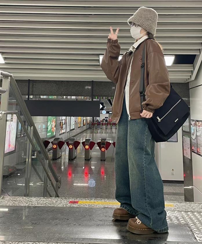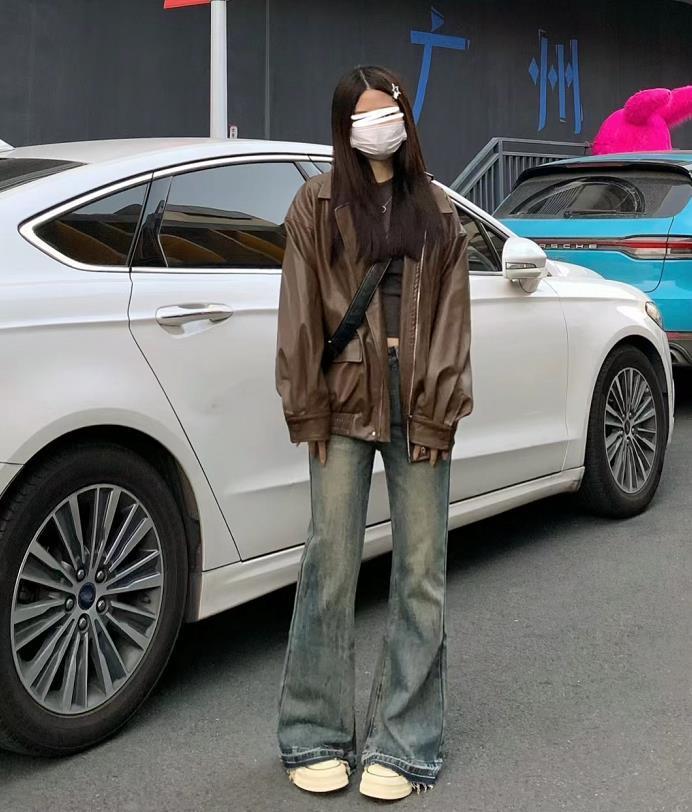 復古棕色皮衣,在秋冬季節裏穿實在是太有氛圍感了,與寬鬆的牛仔闊腿褲相配,將鬆弛感演繹得很棒。上短下長的組合,不僅修飾身材比例,還顯腿長高挑。