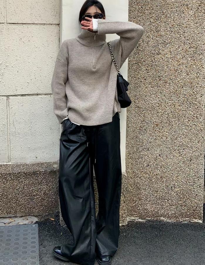 很愛這種簡約又高級的穿搭,高領的毛衣,很基礎百搭的款,搭配黑色直筒皮長褲,加上一雙黑色的鞋子,褲鞋同色把腿部線條拉得很修長。