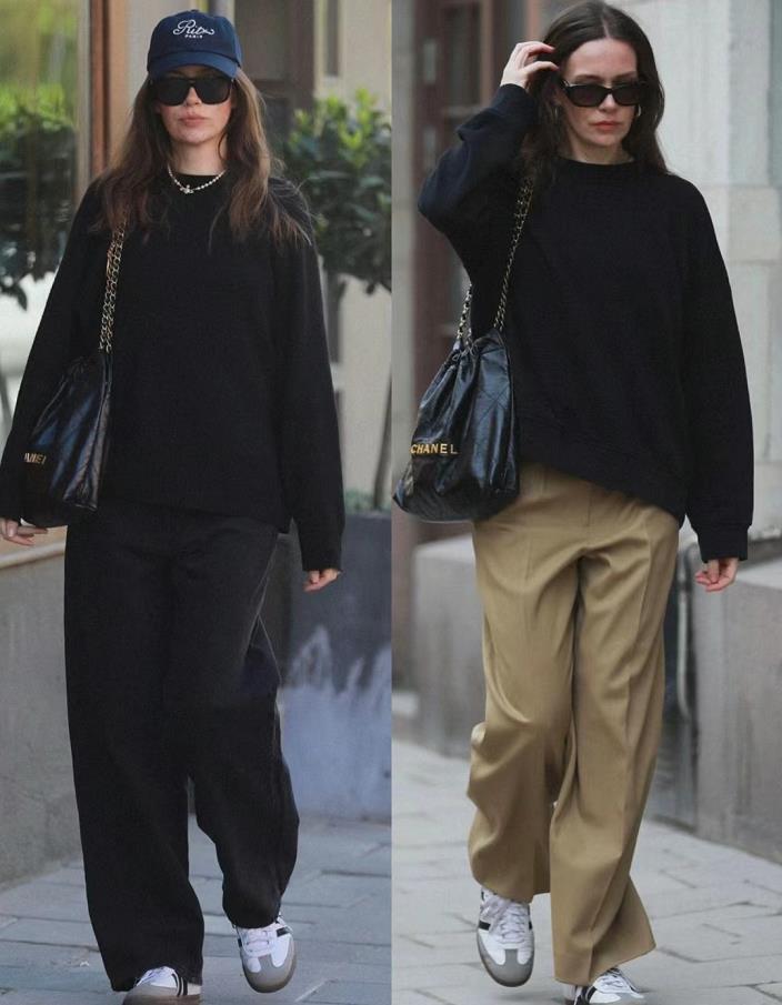 上下裝都選擇黑色會沉悶單調?你可以在鞋子和配飾上入手,選擇一些對比色的單品就行。棕色鞋子+帽子,不僅進行了呼應,還讓黑色的穿搭看起來吸睛太多了。
