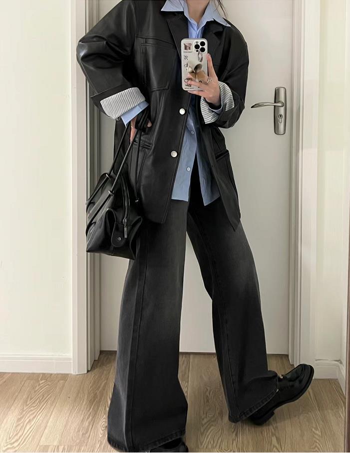 黑色皮衣穿起來就是那種很酷颯、很拽姐的味道,裏面藍色襯衫疊穿,增加了層次感,保暖且時髦。下身搭配牛仔闊腿褲,隨性自在又減齡。