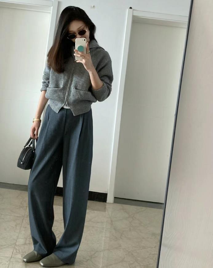 毫不費力的穿搭,灰色毛衣+灰色休閒西裝褲,高級感十足,利用的是上短下長的組合,優化身材比例也顯高挑。