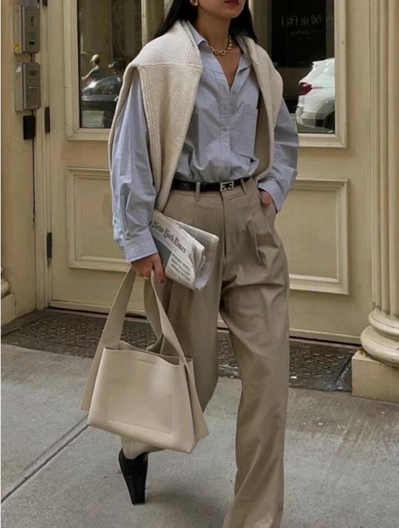 淺色的休閒西裝褲穿起來也不會讓人覺得嚴謹,因爲版型的問題,更多了幾分休閒感。這種褲子與很多上衣都很相配,襯衫、毛衣等都行。