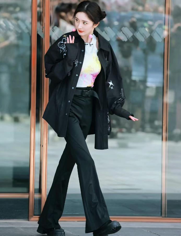 楊冪最近這幾件的衣品可是越來越好了,這一套私服穿搭瞧着就少女感十足,法式黑色塗鴉襯衫+顯瘦的喇叭褲,內搭的印花背心,讓這一身看起來就沒有那麼單調。
