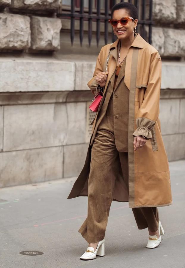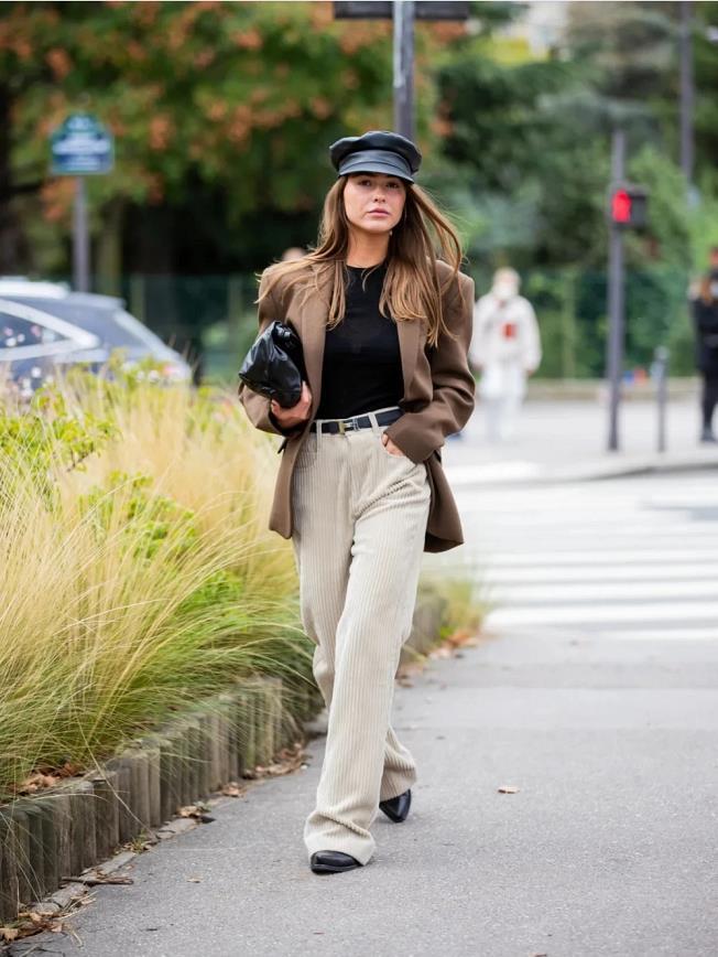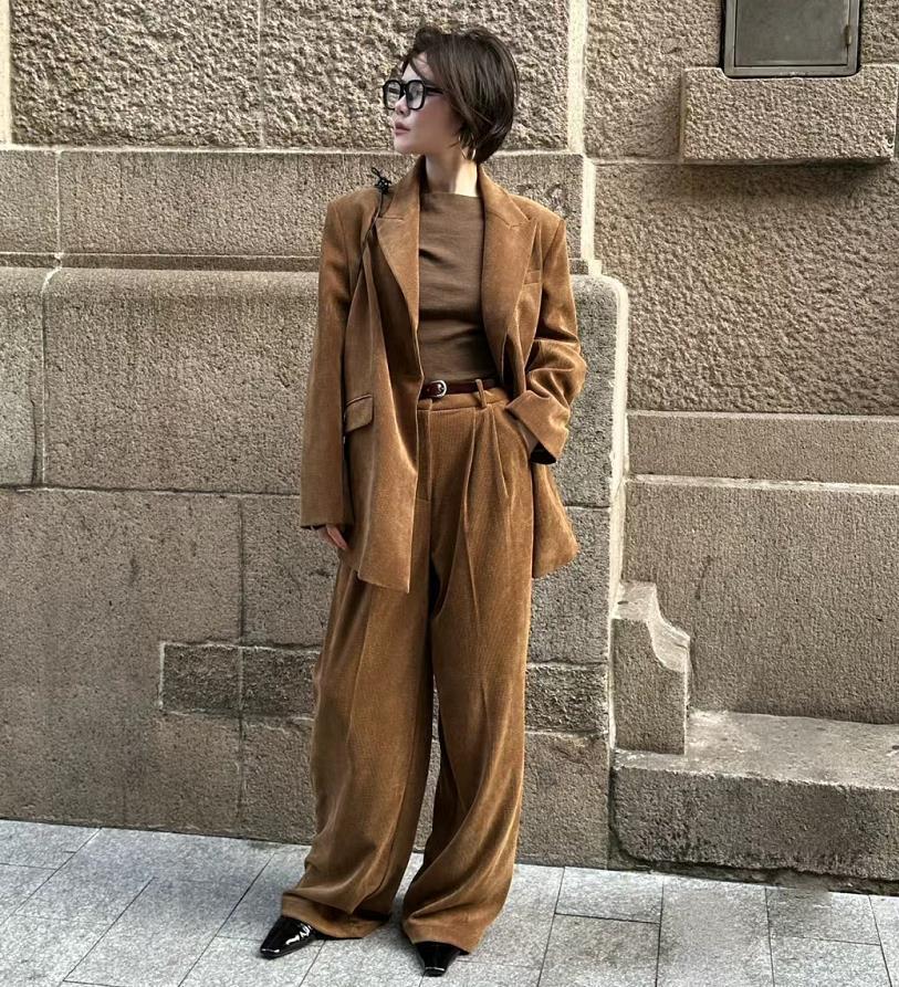 棕色西裝外套+淺色燈芯絨長褲,深淺的結合,頗有對比性,也爲整個穿搭製造出層次,可時髦了。