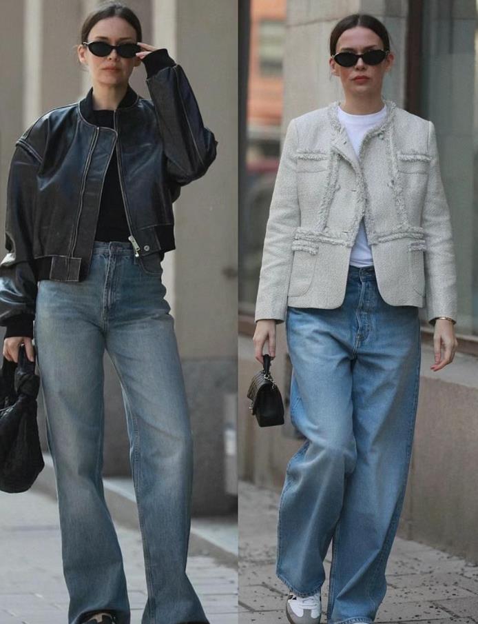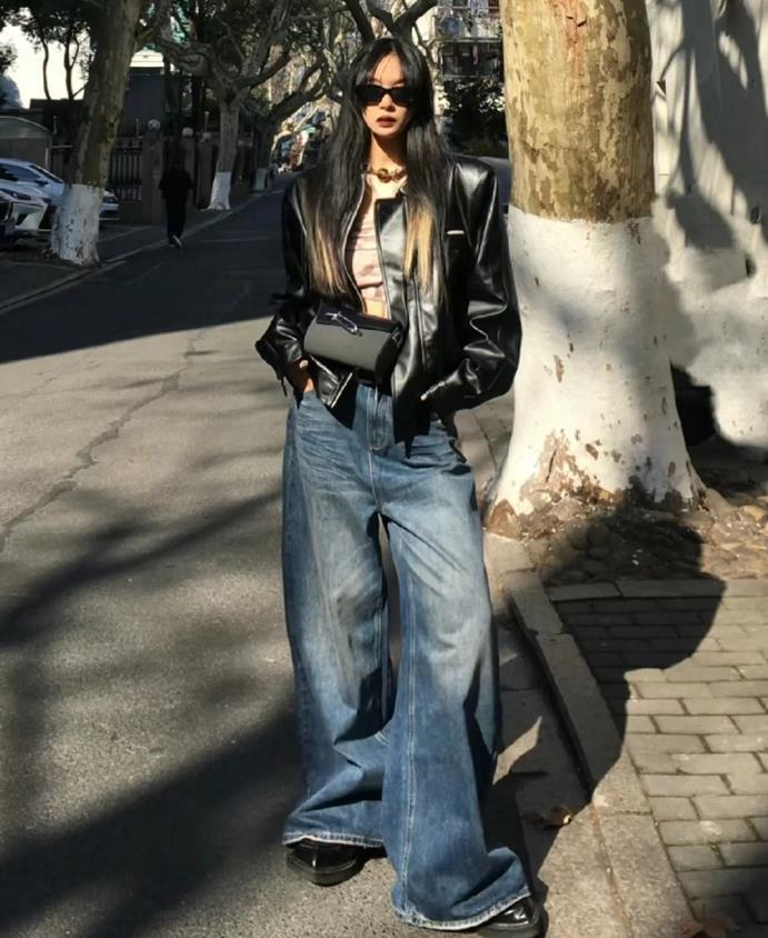 牛仔闊腿褲是真的帥,也很百搭經典,與任何一種上衣外套相配都不出錯,特別是這種拖地的牛仔闊腿褲,誰懂啊,搭配皮衣外套來穿,酷女孩就這麼打造了。