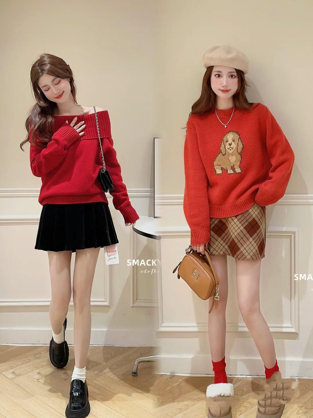 稍微個性一點的紅色針織衫,不僅更加時髦喜慶、穿起來也會格外的洋氣。比如一字肩的紅色針織衫、就可以塑造出優越的肩頸線。