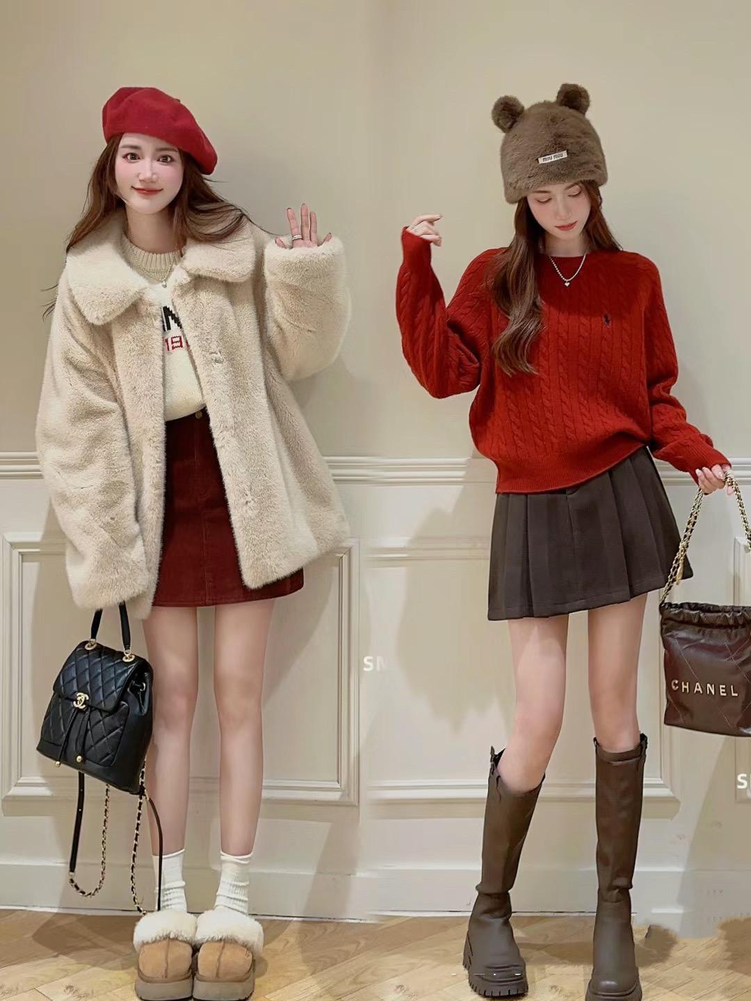 絞花設計的紅色毛衣,穿起來更加溫柔大方。稍微寬鬆的版型,舒適度和高級感都在線。直接用紅色絞花毛衣配A字形百褶裙,就甜美大方。