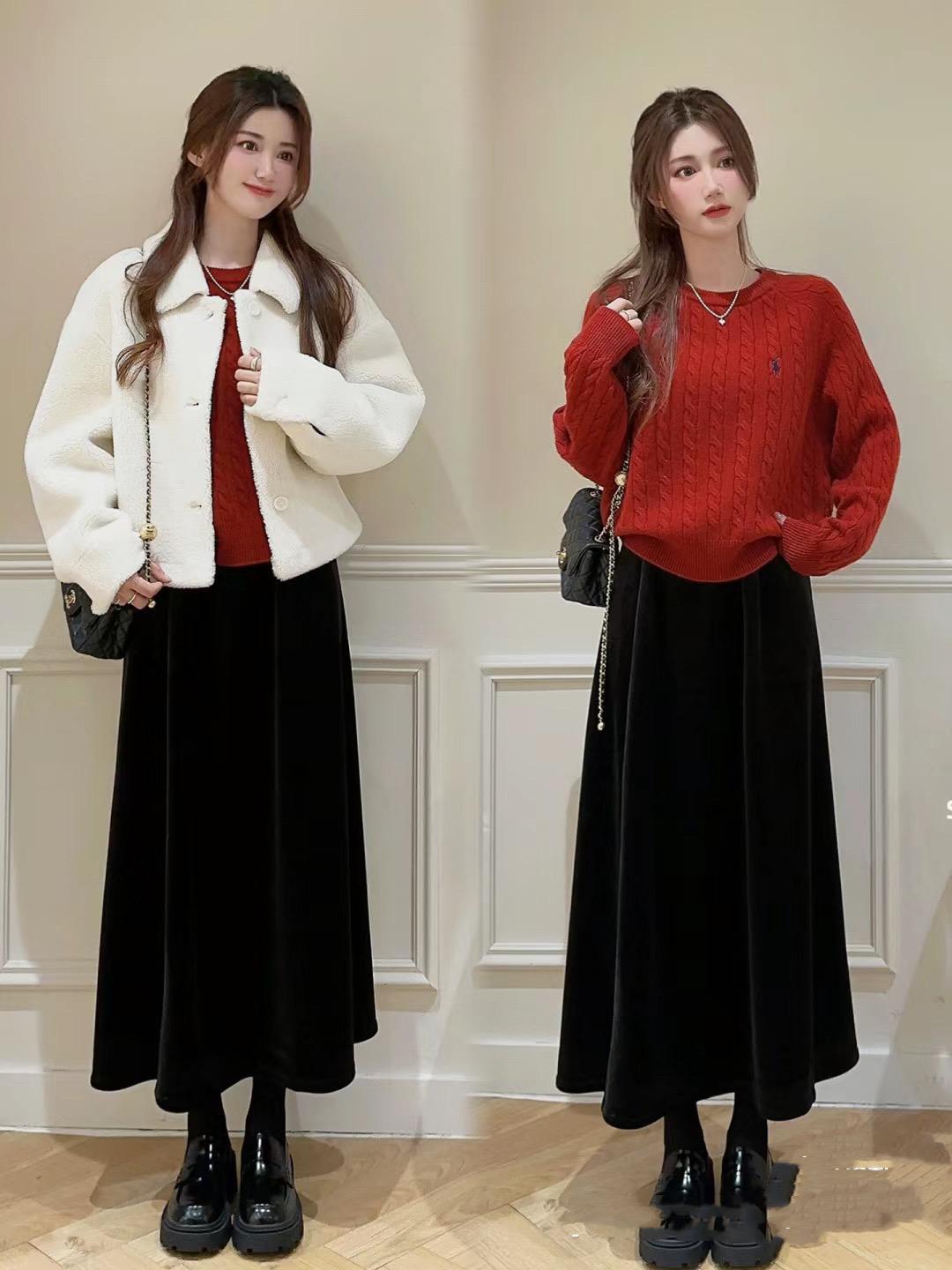 黑色系的過膝半身裙,是一種更加低調百搭的單品。尤其是這種絲絨質地的黑色半身裙,A字形的裙襬大方流暢。帶着光澤感的絲絨半身裙,新年穿也很顯貴氣。